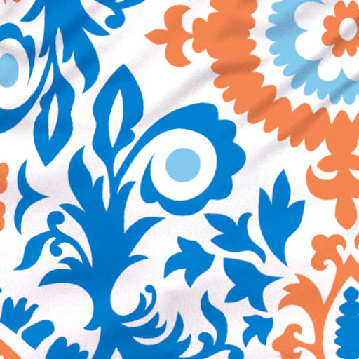 A playful mix of florals and geometric shapes in orange, aqua and navy with contrasting back to front color detail. Designed by Debra Valencia.