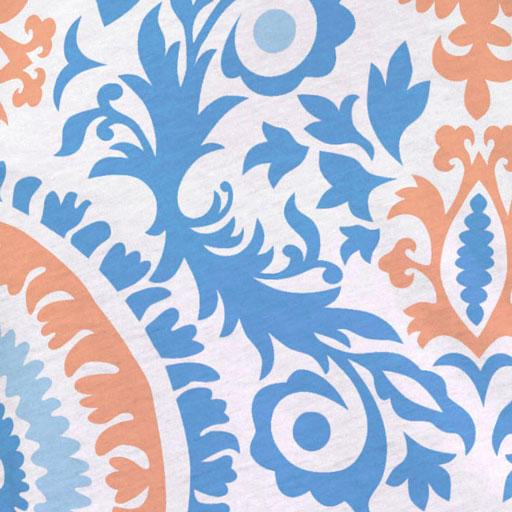 A playful mix of florals and geometric shapes in orange, aqua and navy with contrasting back to front color detail. Designed by Debra Valencia.