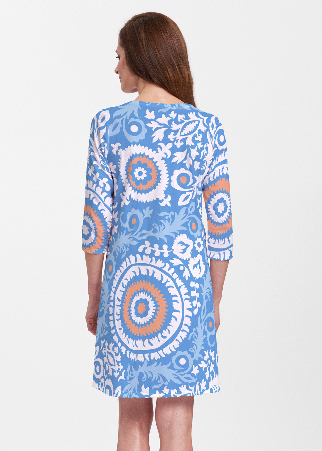 A relaxed swing silhouette with 3/4 sleeves and v-neck make up the newest edition to our Classic dress collection. Hem falls just above the knee.