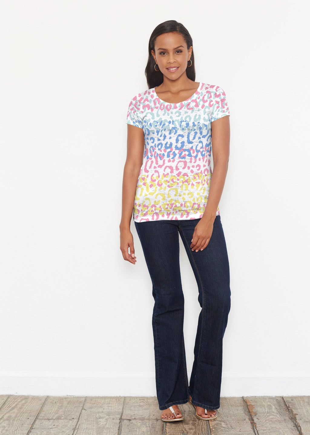A fun and flirty leopard print with ombre colors in pink, aqua, blue and yellow. Go wild for this print! Designed by Susan Werner.