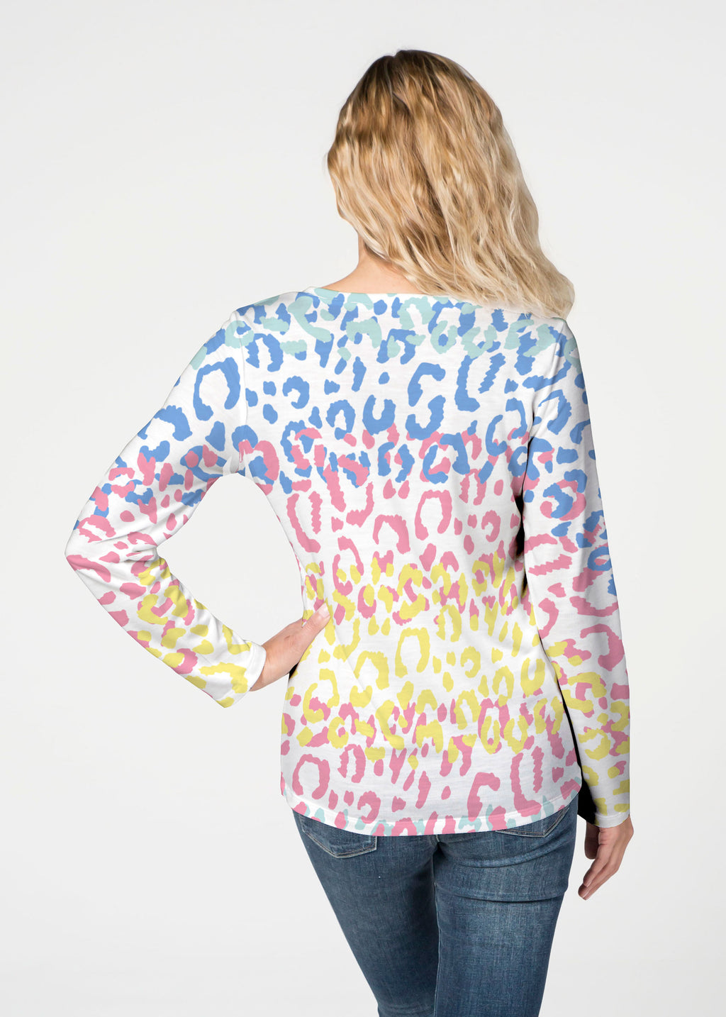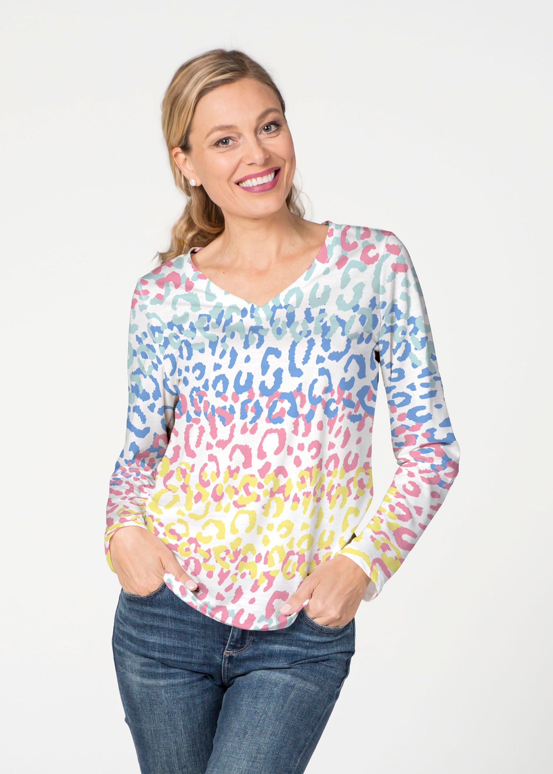 A fun and flirty leopard print with ombre colors in pink, aqua, blue and yellow. Go wild for this print! Designed by Susan Werner.