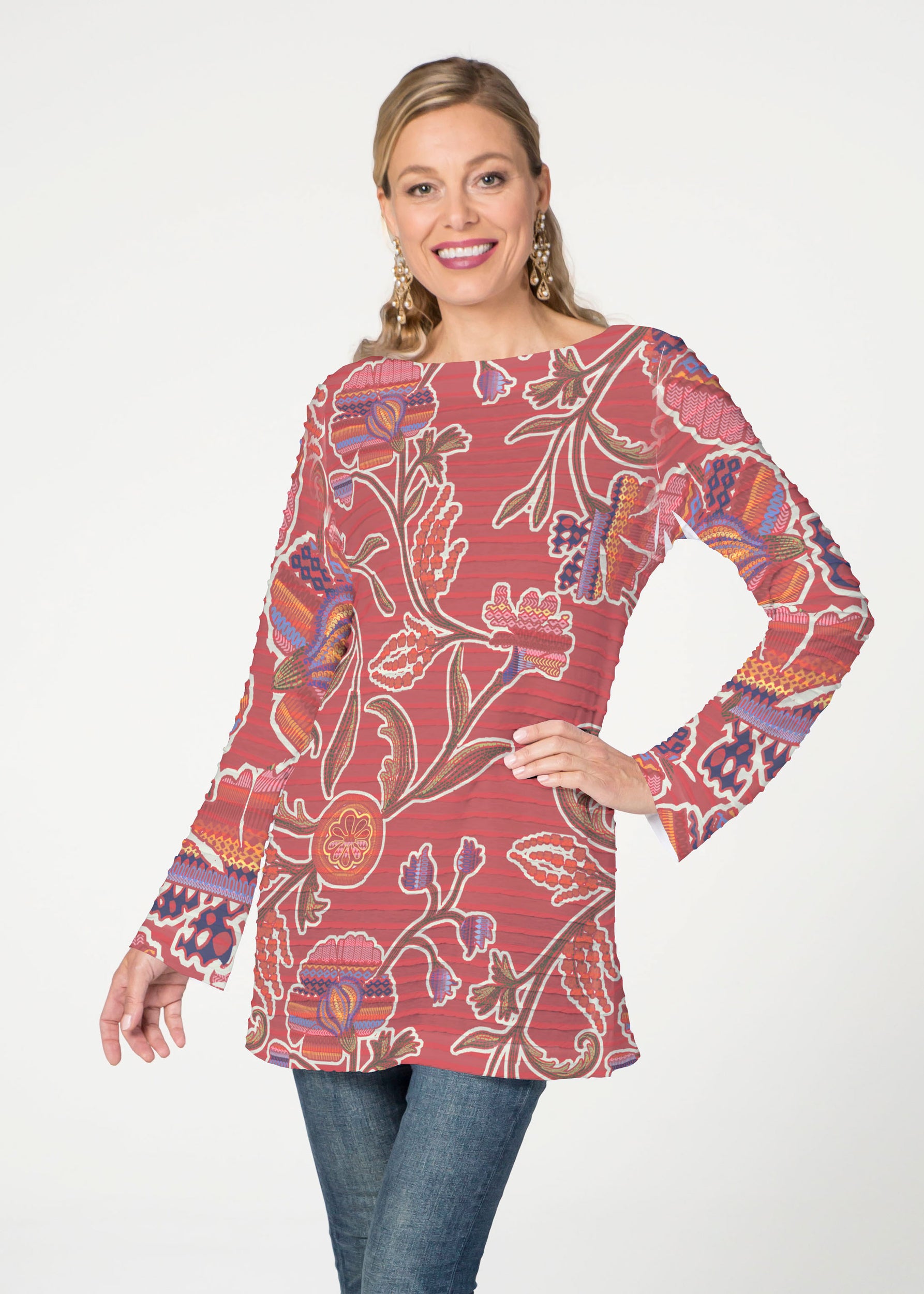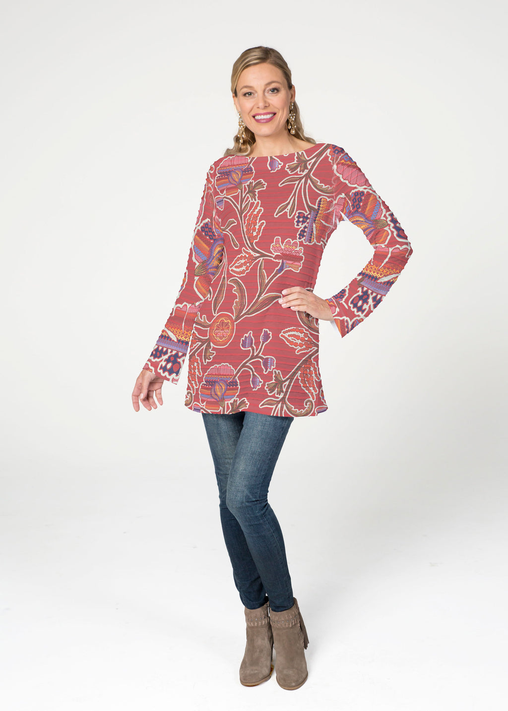 The Banded Boatneck Tunic has the soft pleated texture of our Banded fabric, making this a sophisticated, casual year round piece. A forgiving fit, side vents, with a relaxed full length sleeve combine for a flattering look. The hemline flows gently over the hip.