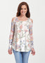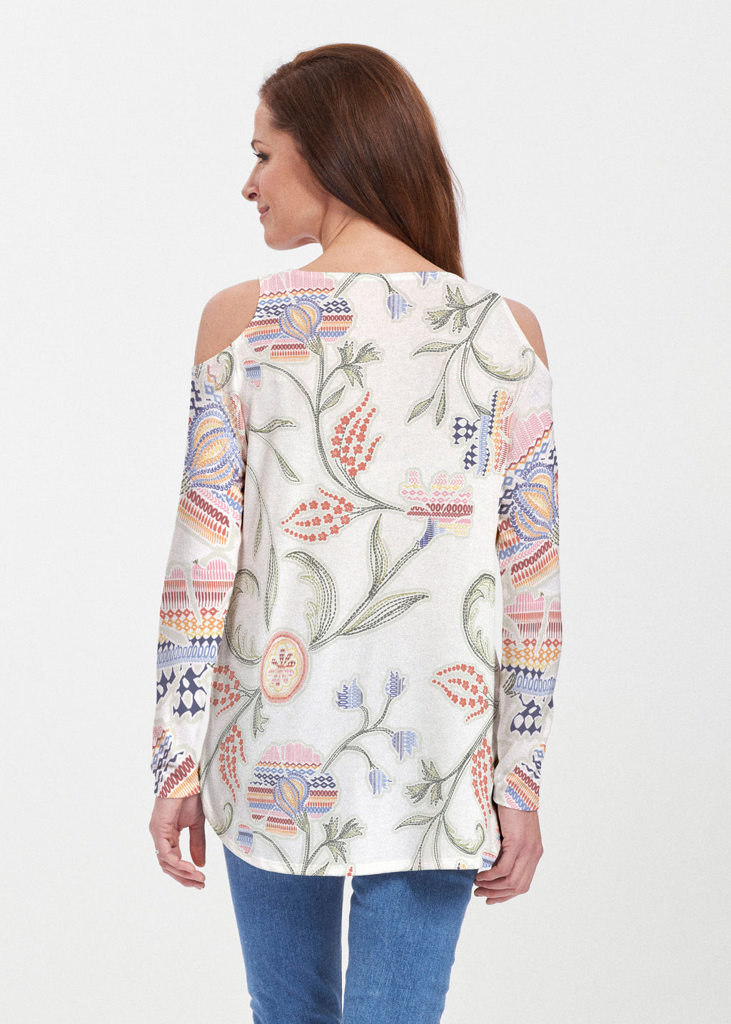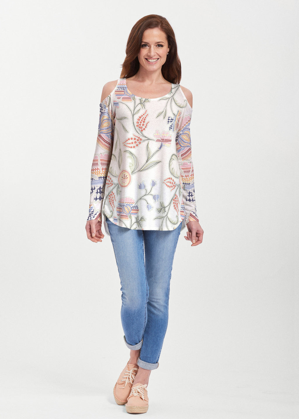 A playful print of stitched floral patterns on a white background and bold mixed sleeves. Designed by Susan Werner.