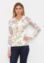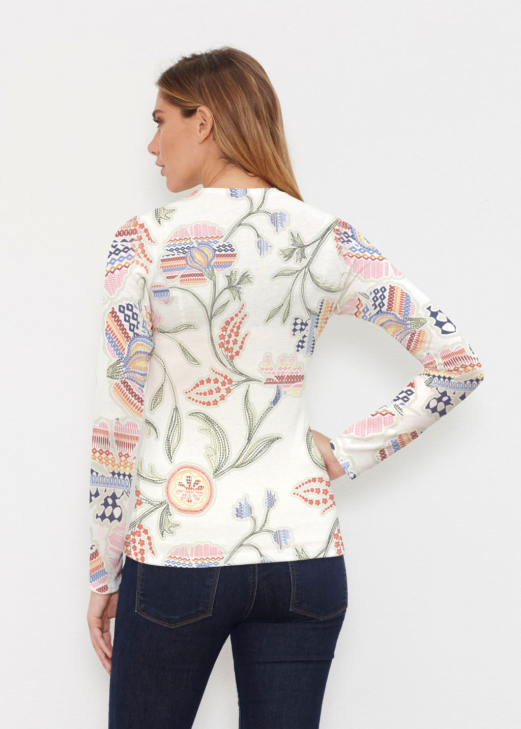 A playful print of stitched floral patterns on a white background and bold mixed sleeves. Designed by Susan Werner.
