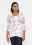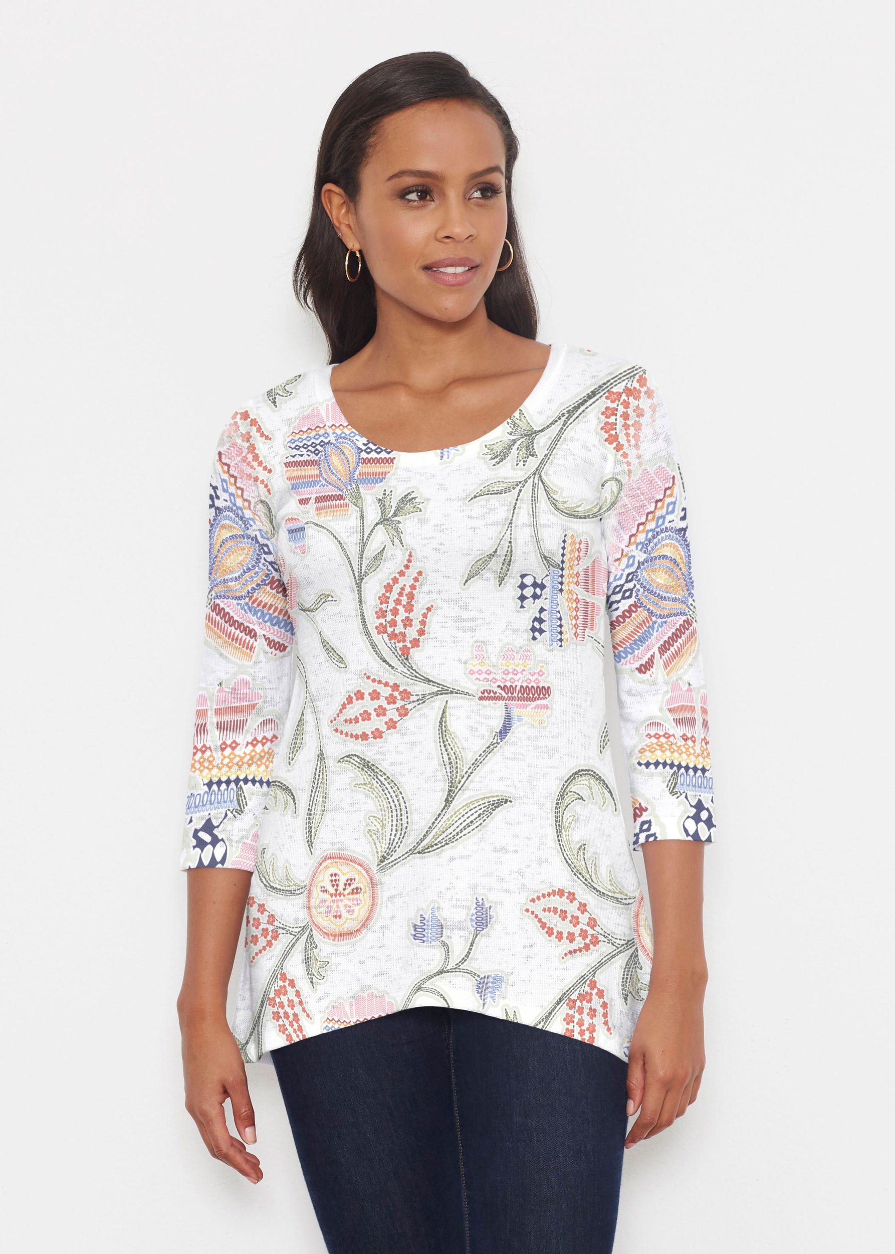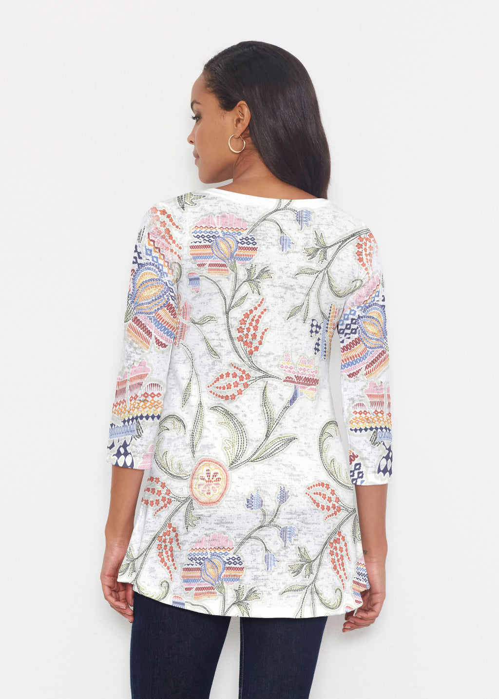 A playful print of stitched floral patterns on a white background and bold mixed sleeves. Designed by Susan Werner.