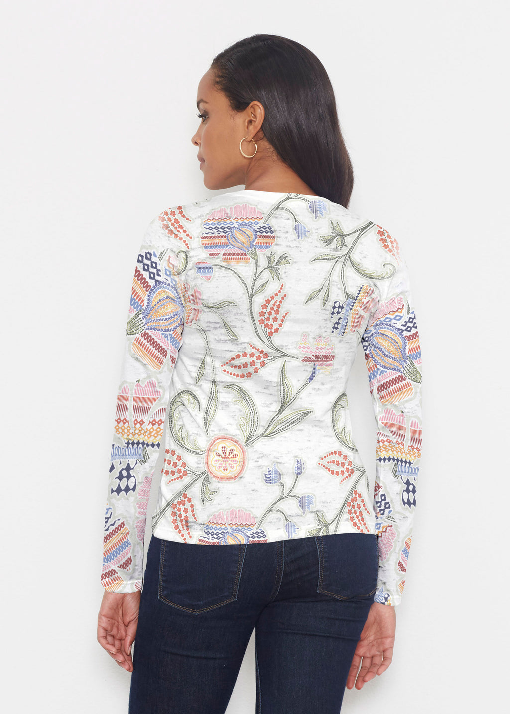 A playful print of stitched floral patterns on a white background and bold mixed sleeves. Designed by Susan Werner.
