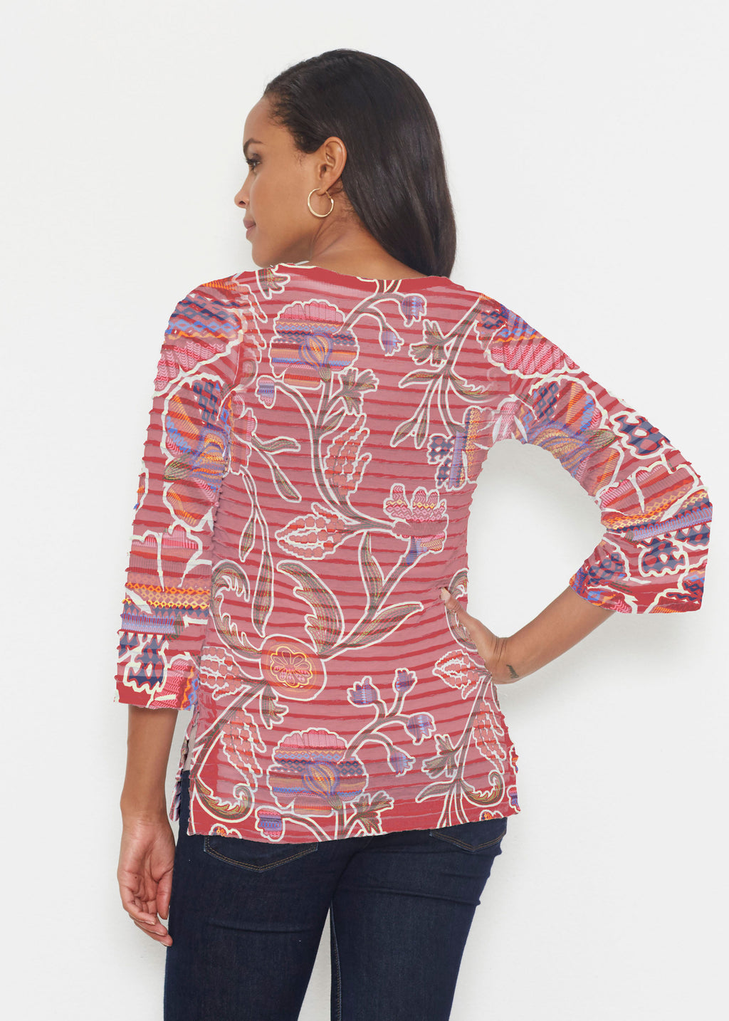 The uniquely soft, pleated texture in this Banded fabric give the 3/4 bell sleeves and sweetheart v-neck a fun and sophisticated look. Flattering side vents adorn the hemline that skims the hip.