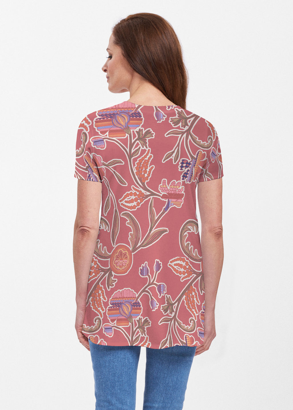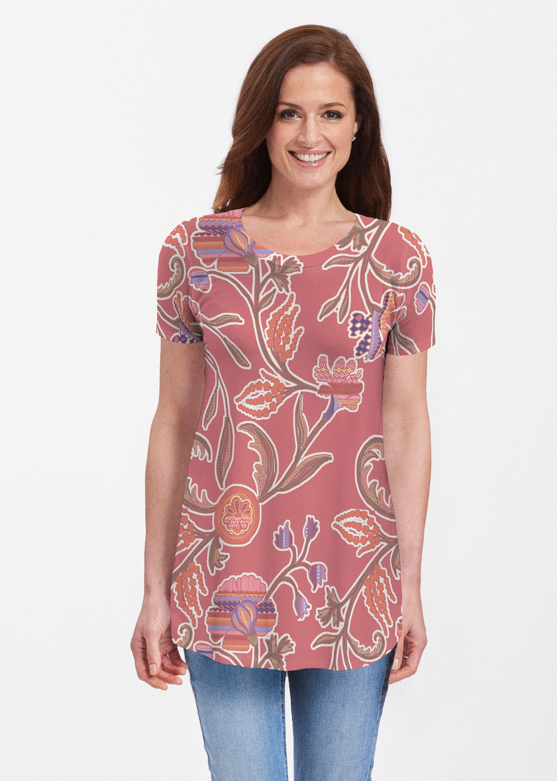 Our soft and feminine short sleeve silhouette tunic is sure to flatter any figure. Made in our Butterknit fabic that flows into a relaxed curved hem that is slightly longer in the back with subtle side slits.