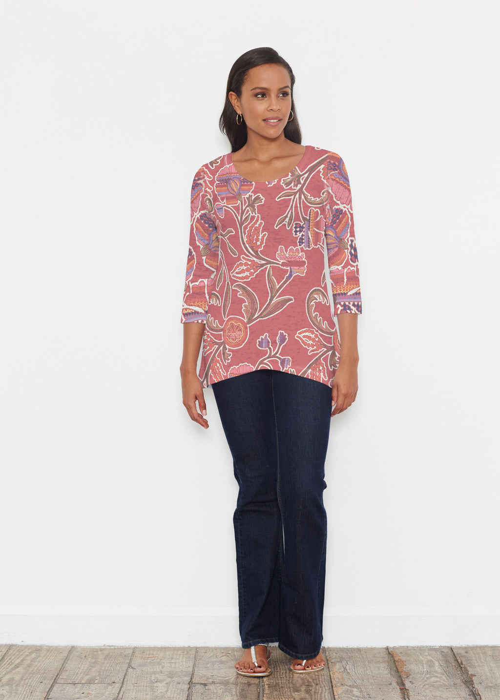 An elegant fit, the hemline falls higher in front then cascades beautifully down across back. Delicate scoop neckline and 3/4 sleeves made in our soft Baby Waffle burnout thermal blend.
