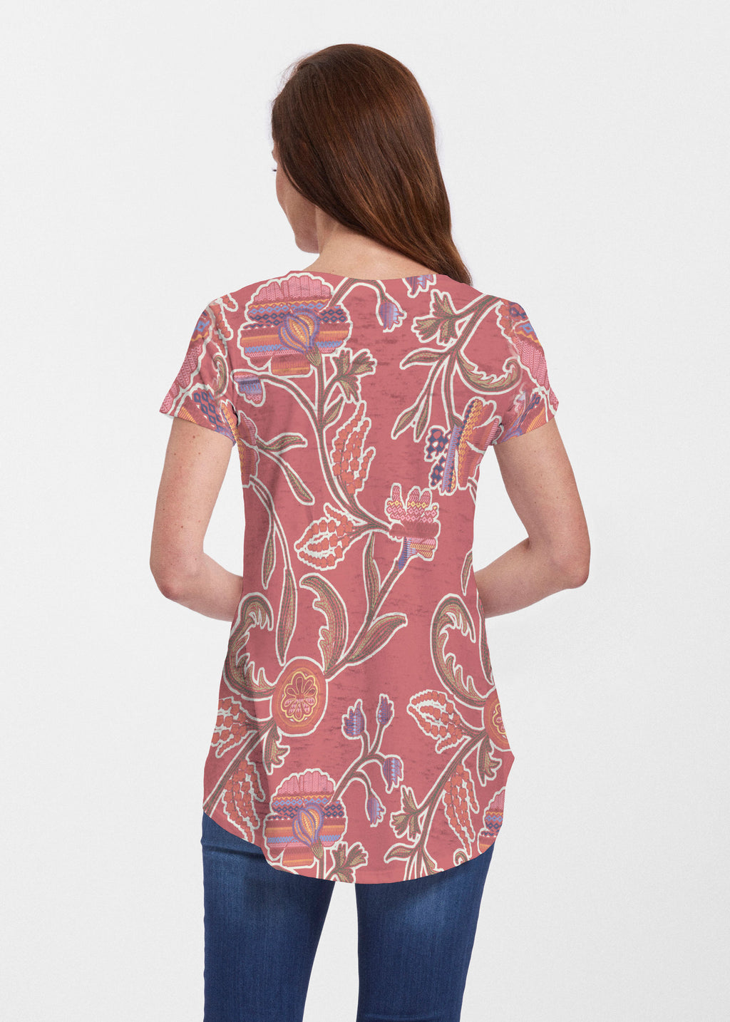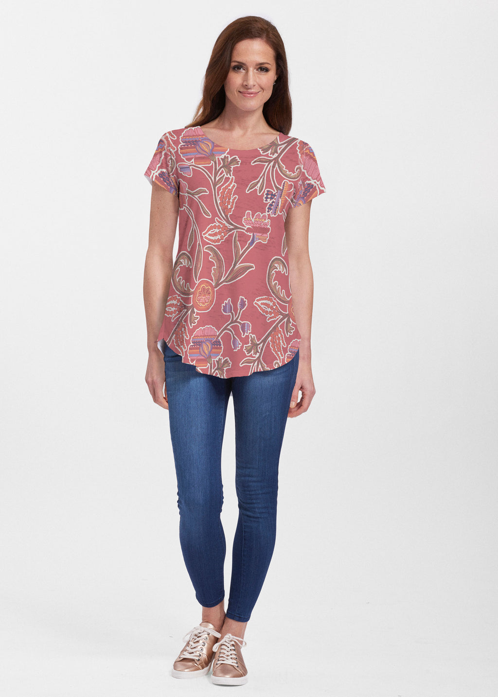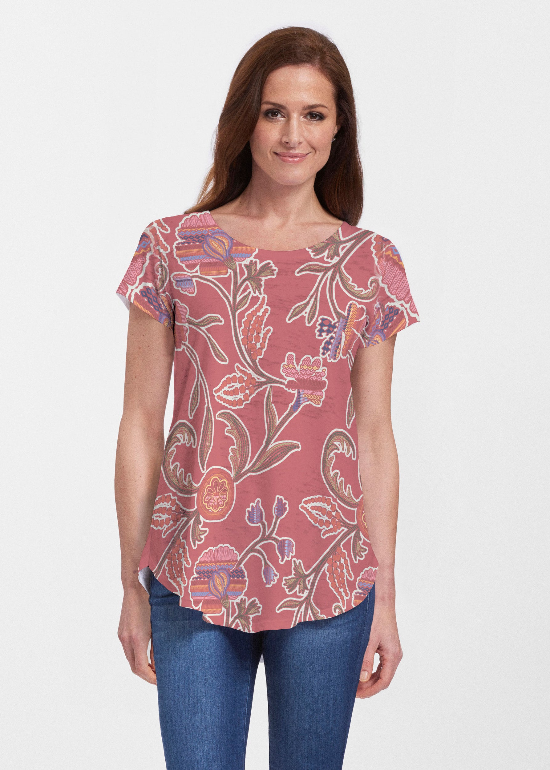 An effortlessly flattering tunic in our soft Signature burnout fabric featuring short sleeves and a scoop neck with a body that flows into a full, swinging shirttail hem.