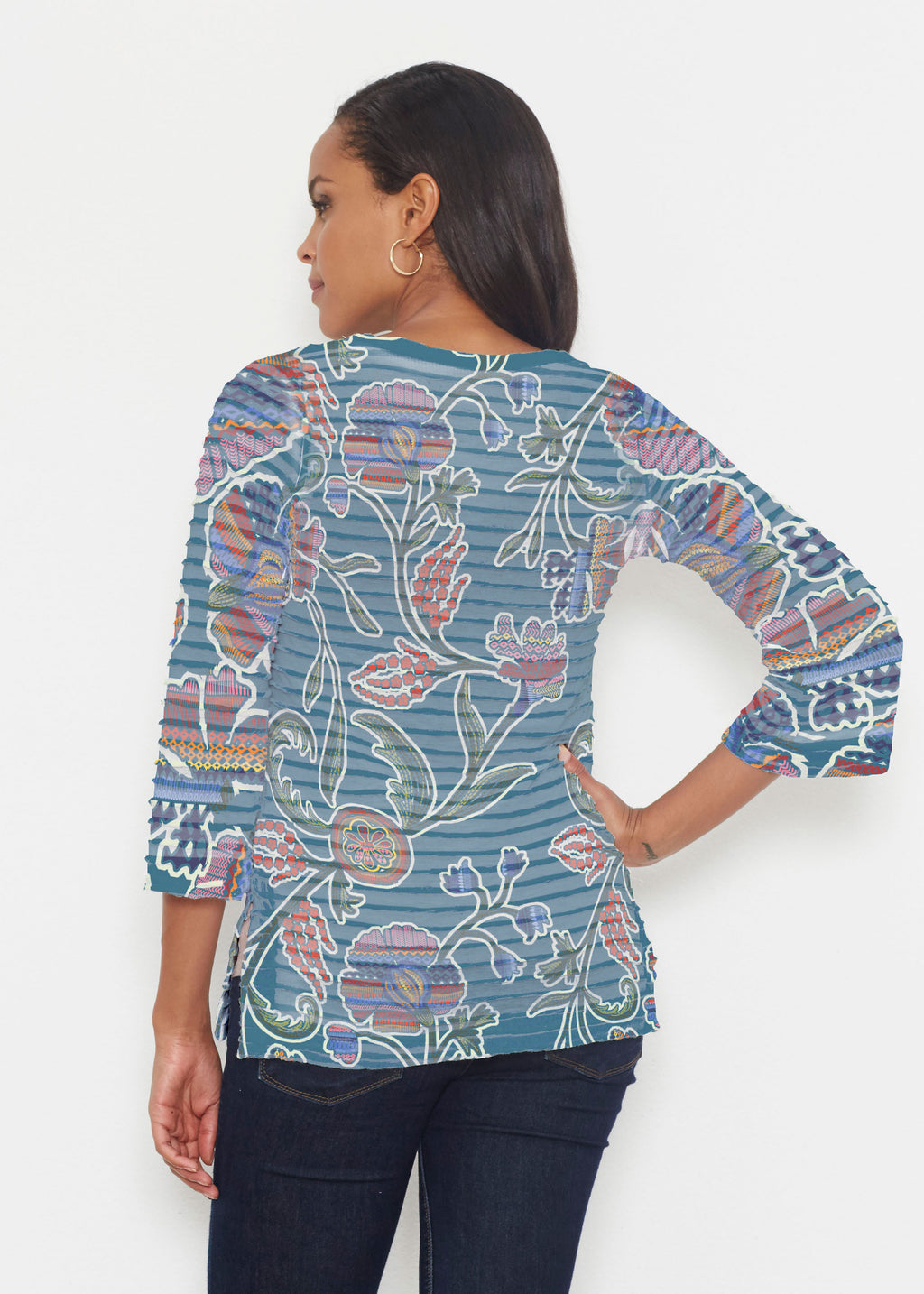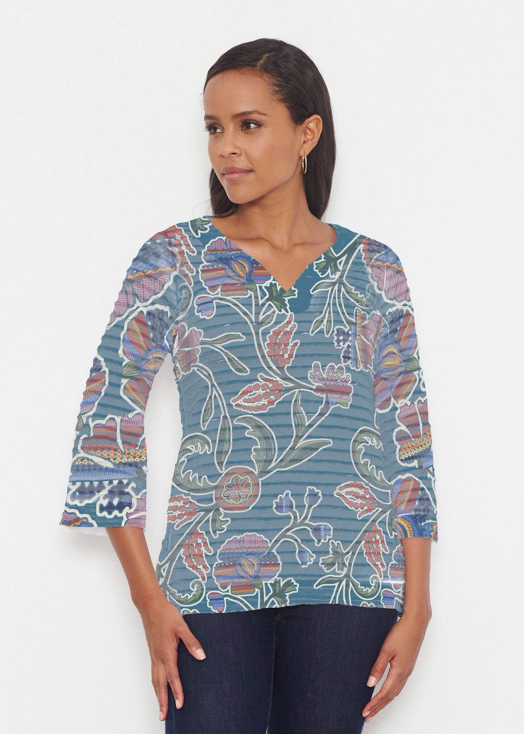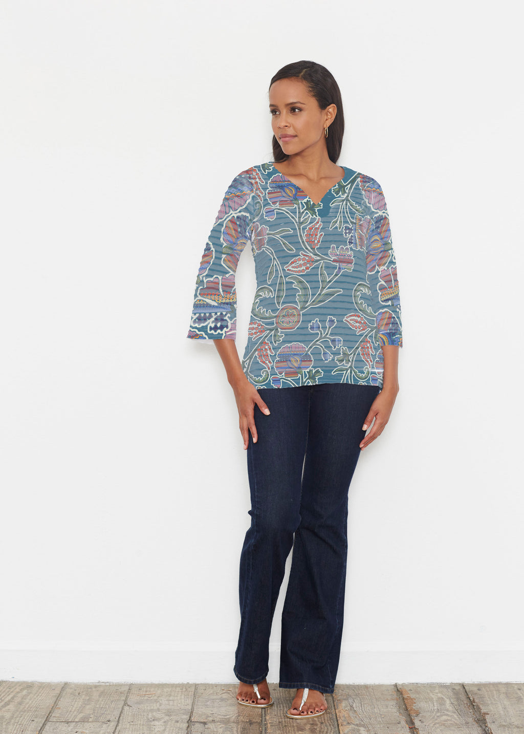 The uniquely soft, pleated texture in this Banded fabric give the 3/4 bell sleeves and sweetheart v-neck a fun and sophisticated look. Flattering side vents adorn the hemline that skims the hip.