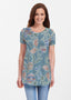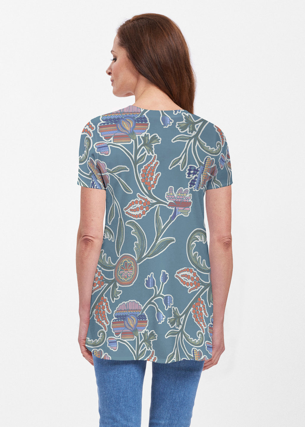 Our soft and feminine short sleeve silhouette tunic is sure to flatter any figure. Made in our Butterknit fabic that flows into a relaxed curved hem that is slightly longer in the back with subtle side slits.