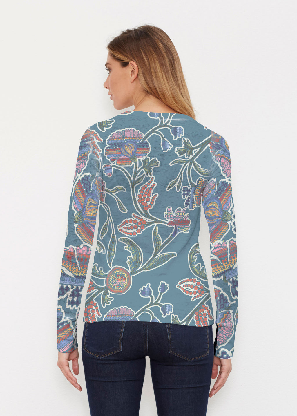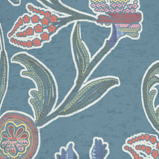 A playful floral print with a beautiful apricot background and bold floral sleeves designed by Susan Werner.