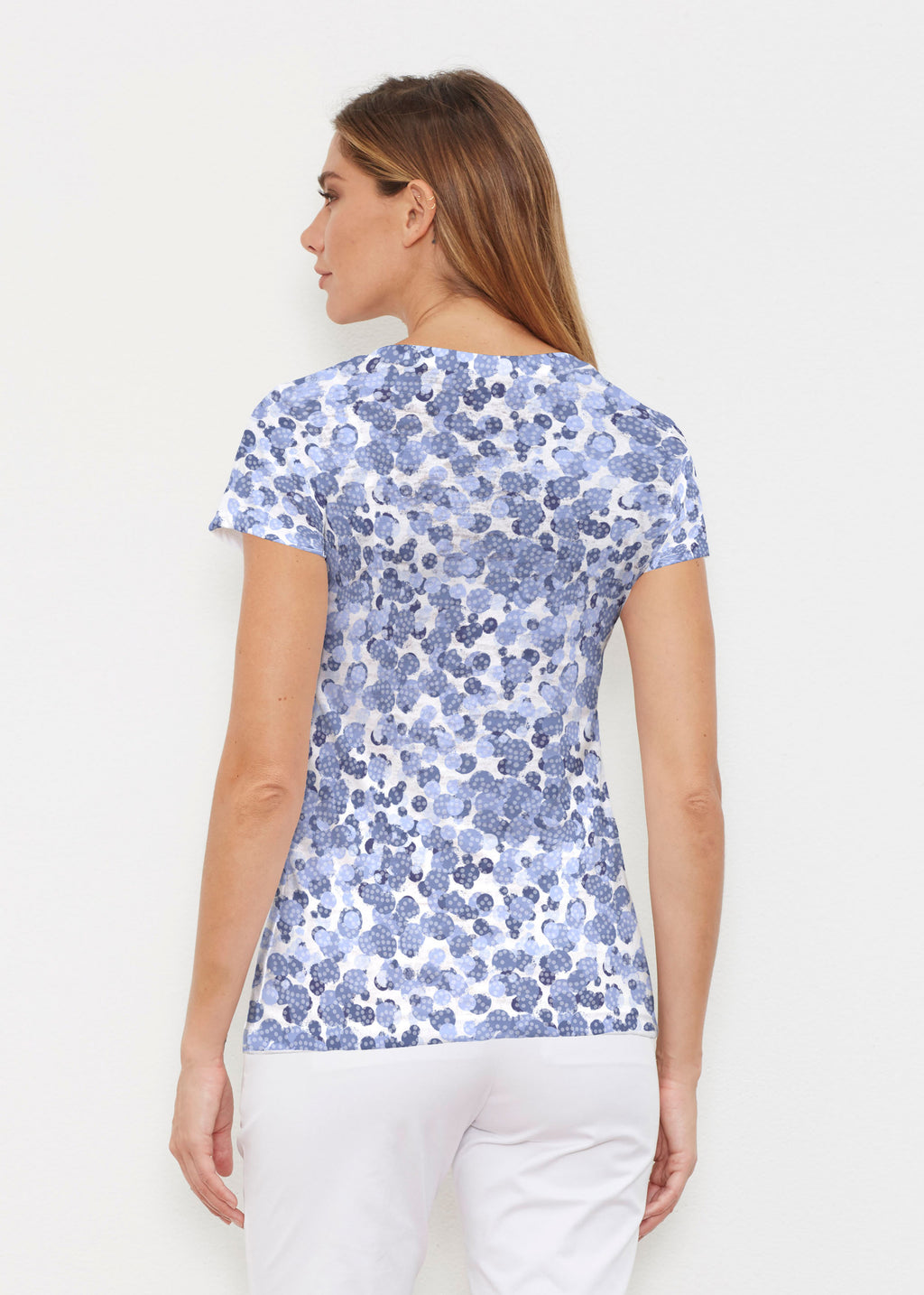 A fun print of mottled dots with chevron inspired mixed sleeves in a beautiful spectrum of blues designed by Susan Werner.