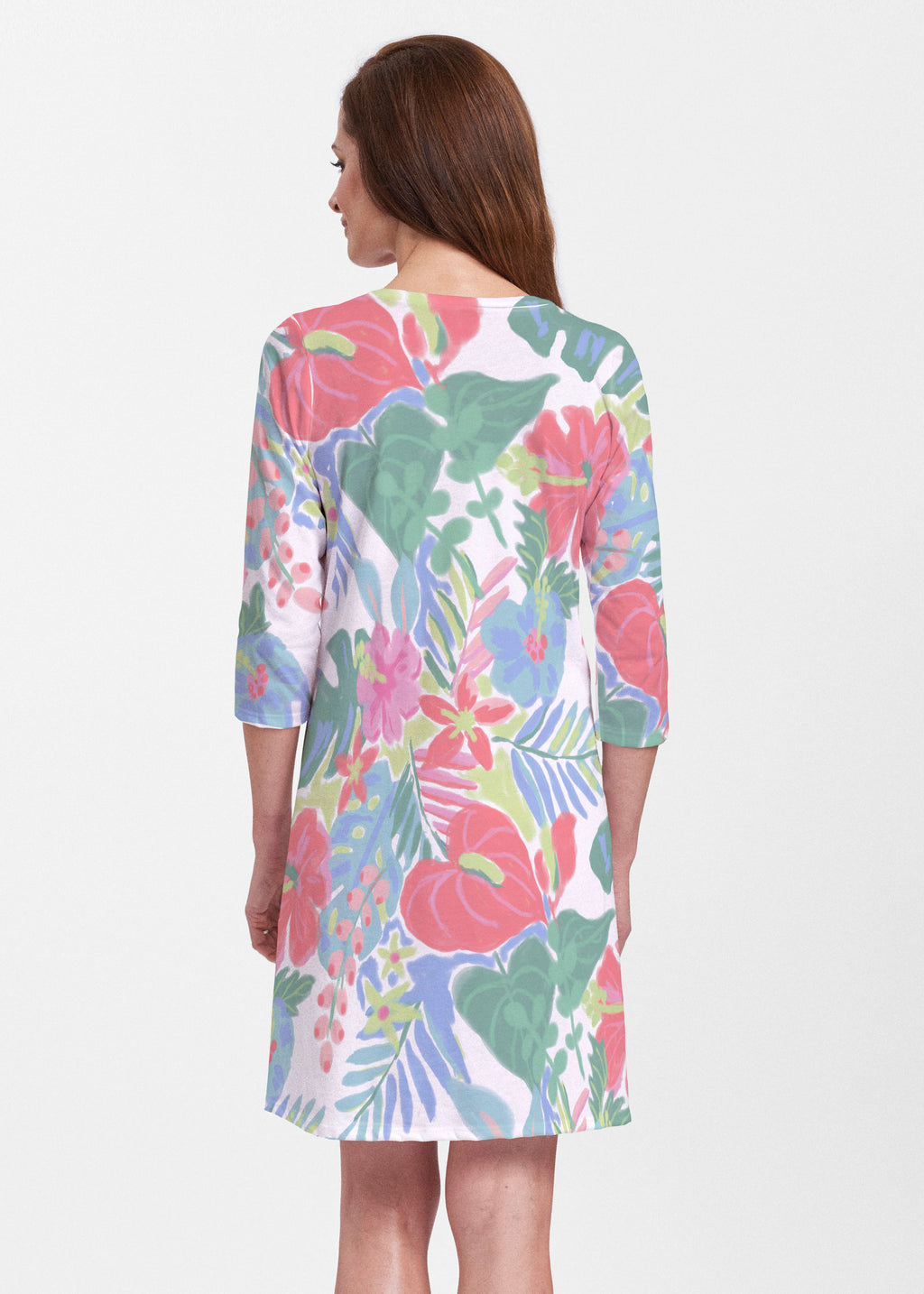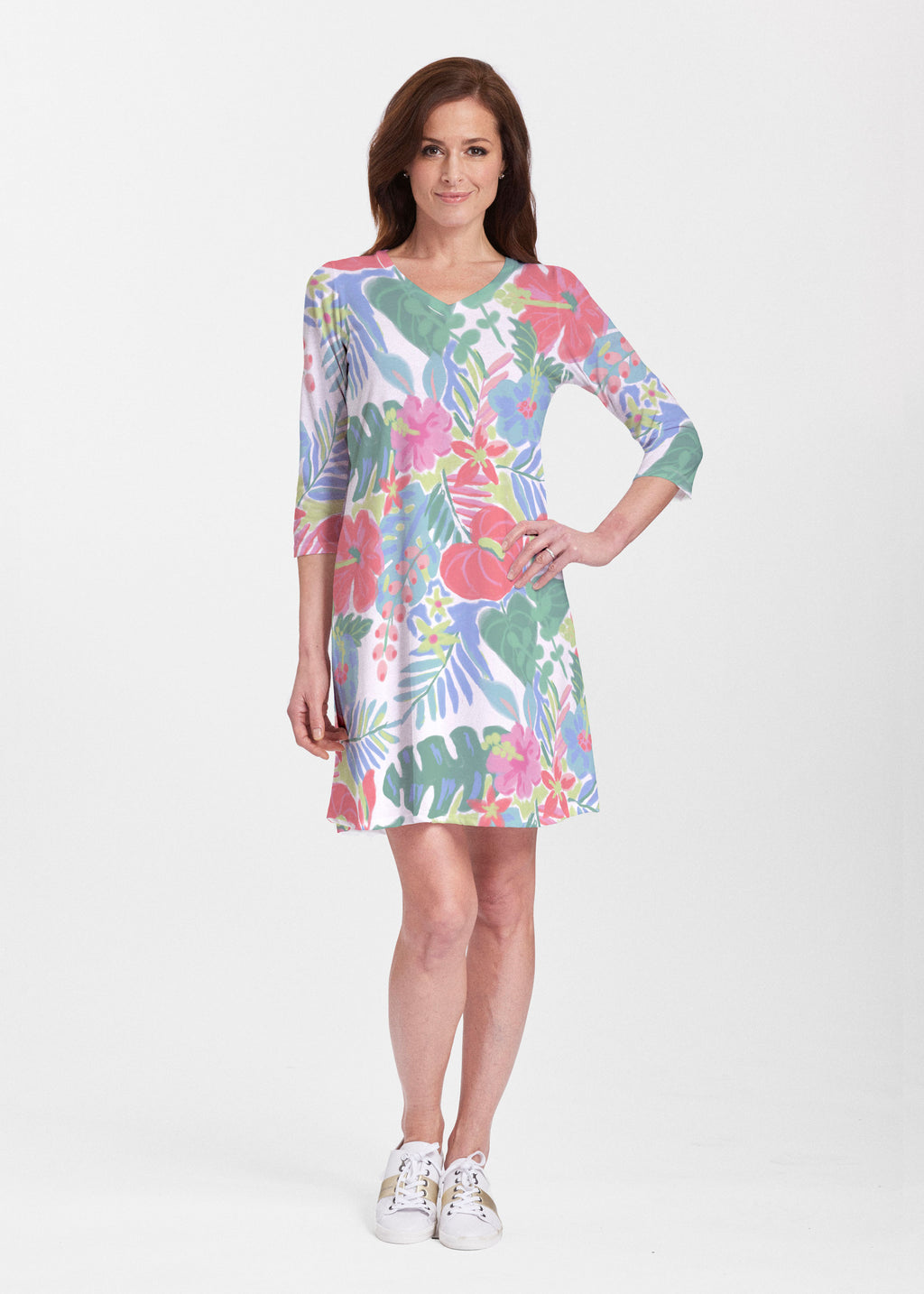 A relaxed swing silhouette with 3/4 sleeves and v-neck make up the newest edition to our Classic dress collection. Hem falls just above the knee.
