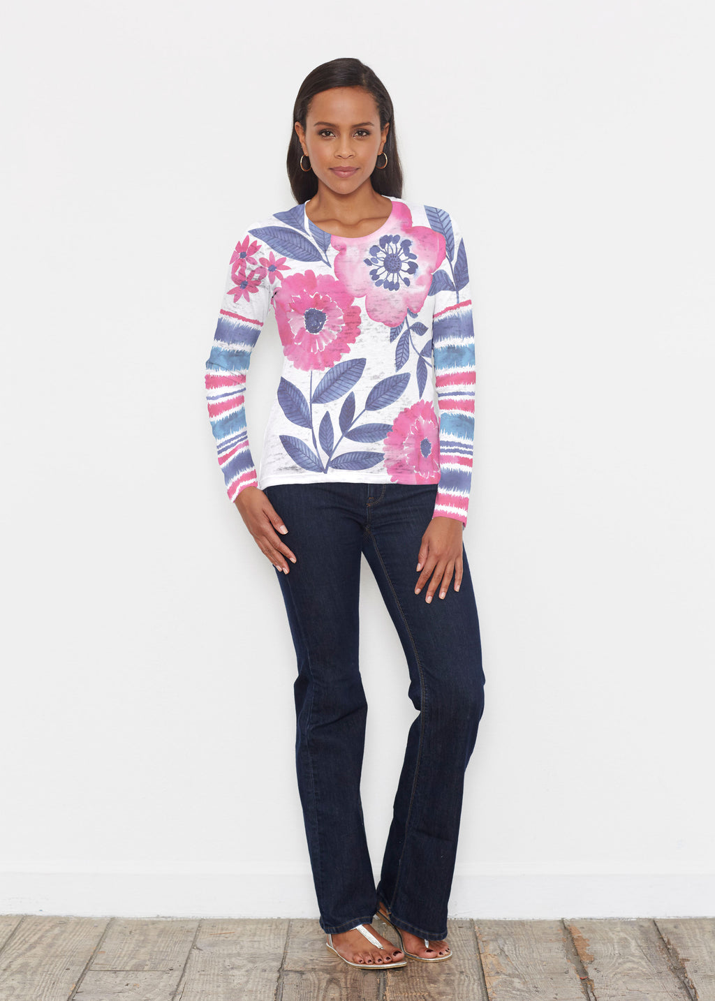 Fun floral print in navy blue and pink with contrasting back and sleeves designed by Diane Kappa.