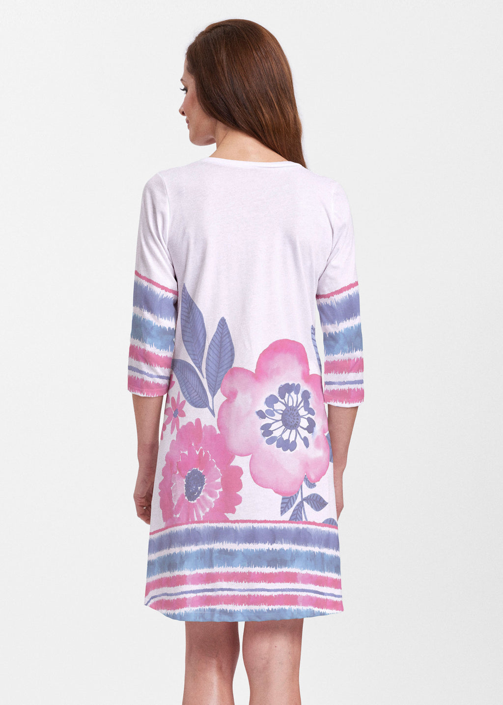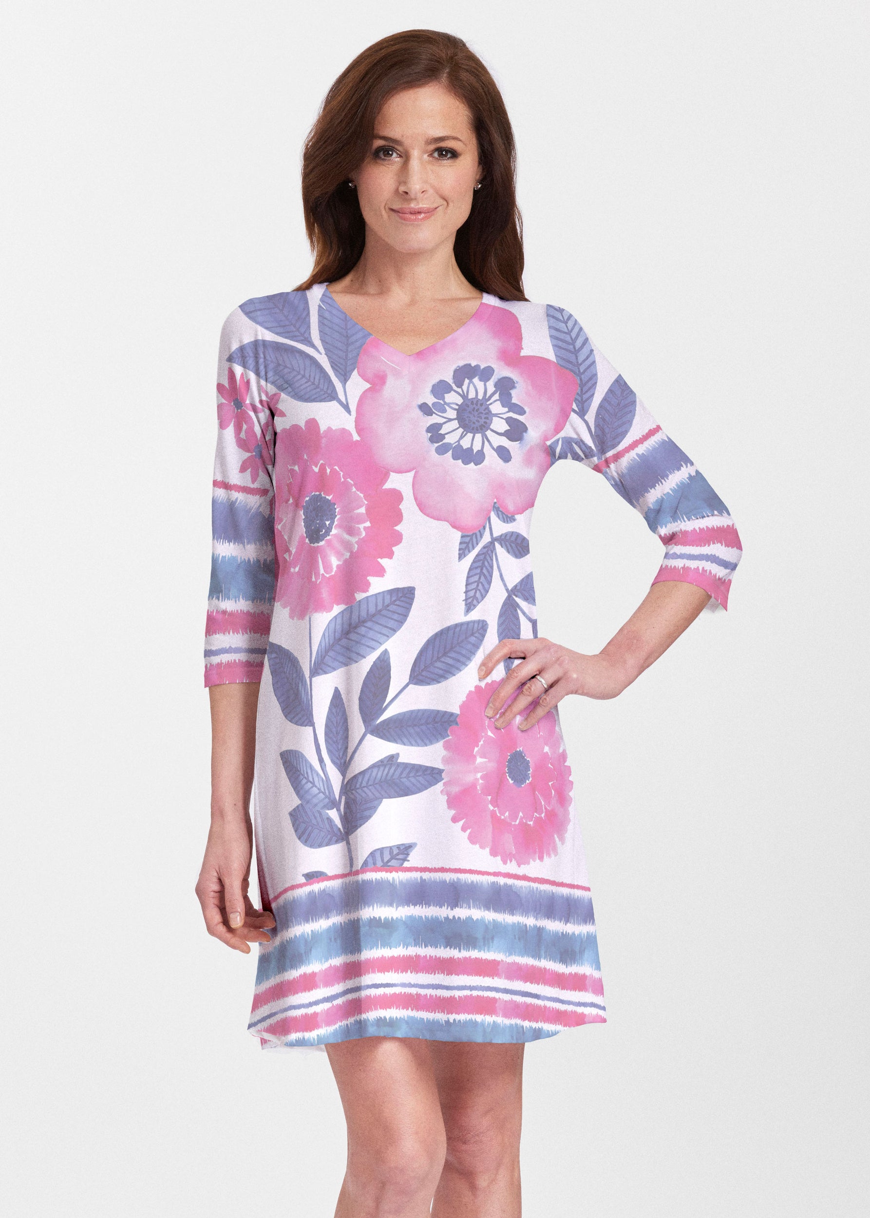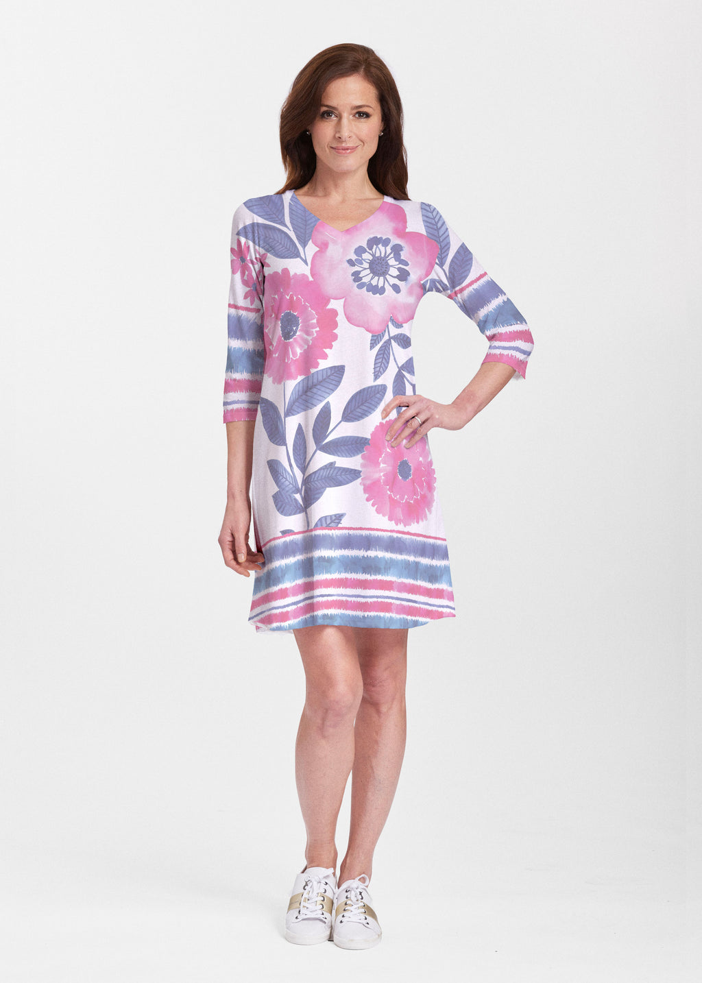 A relaxed swing silhouette with 3/4 sleeves and v-neck make up the newest addition to our Classic dress collection. Hem falls just above the knee.