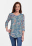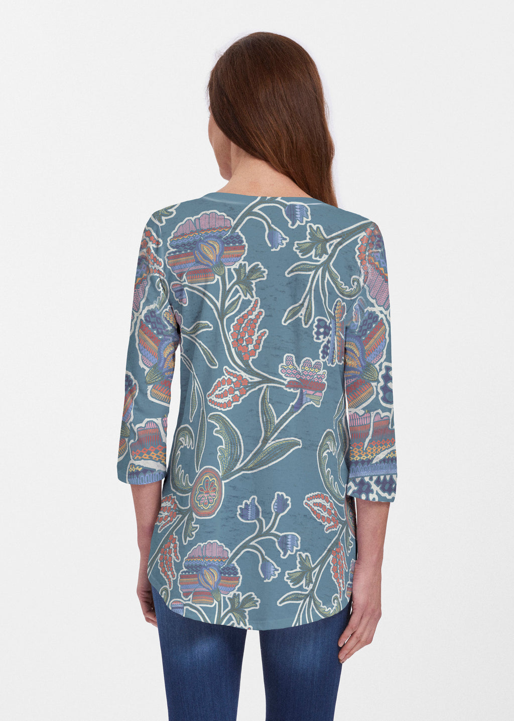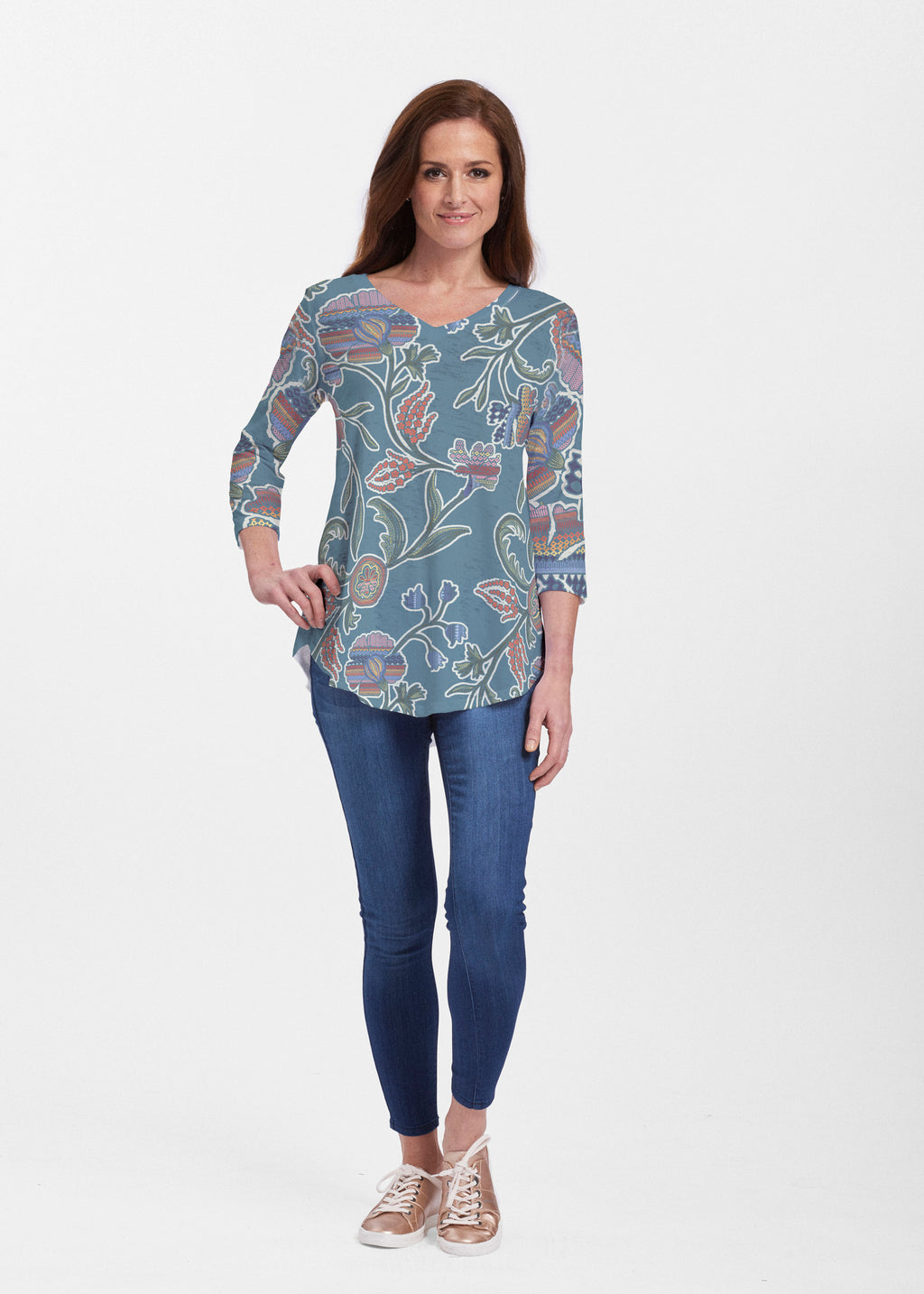This v-neck tunic in our Signature burnout fabric is forever flattering. 3/4 sleeves and a v-neck flow into a full, swinging shirttail hem.
