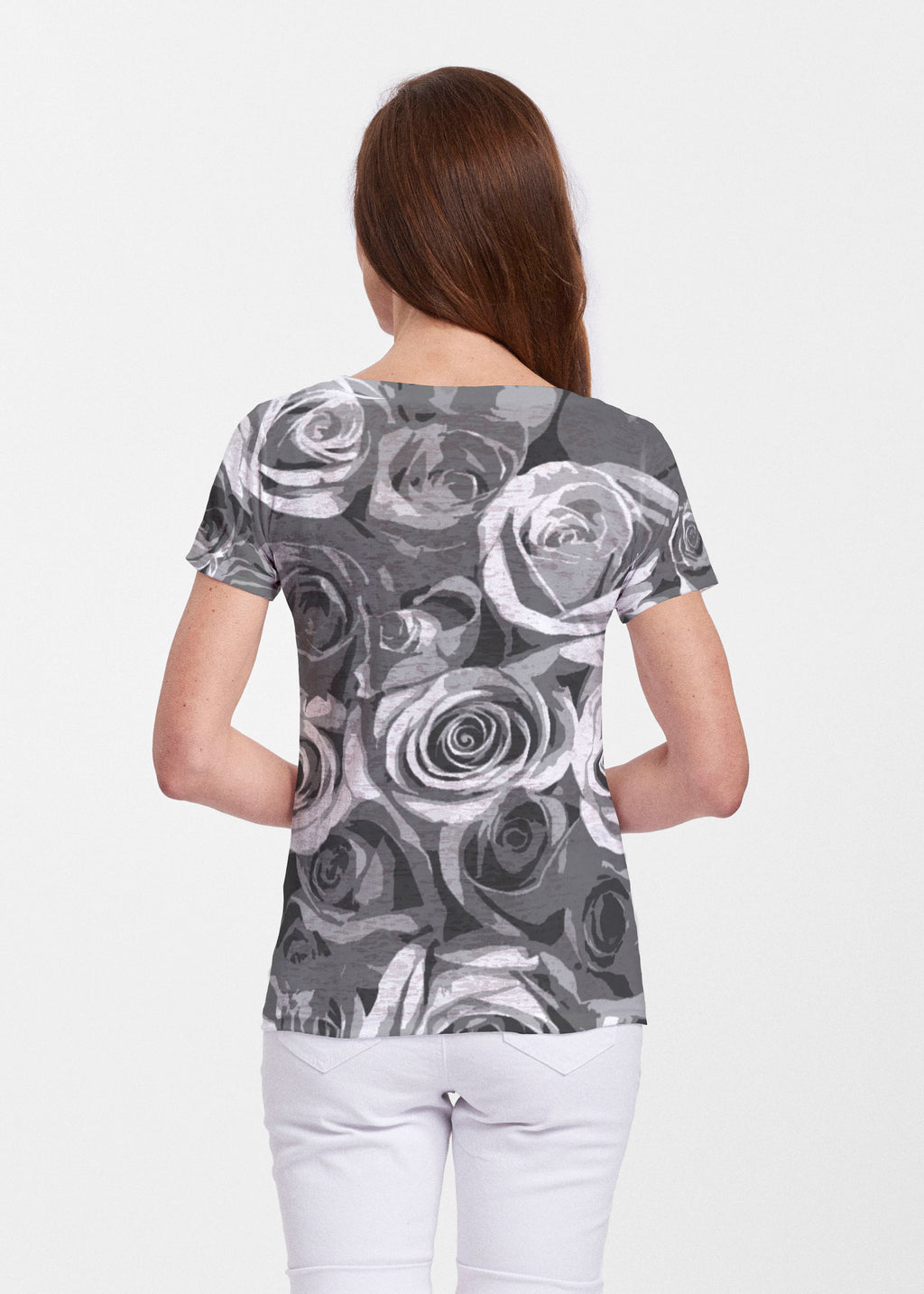Versatile and fun, a striking rose print in shades of black, grey and white pairs with almost any wardrobe.