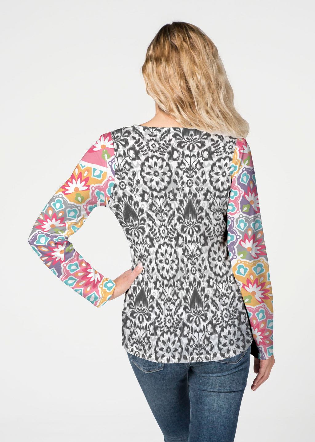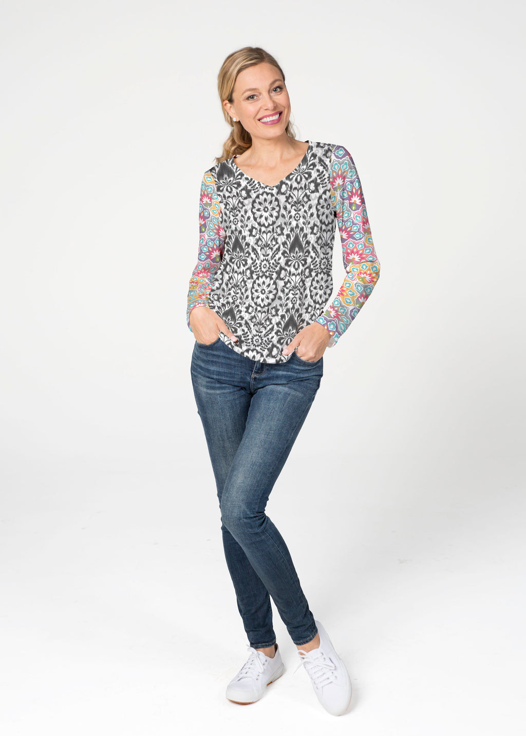 Whimsy print in black and white with bold floral contrasting sleeves in pink, purple, yellow and aqua – a design collaboration of Whimsy Rose and Diane Kappa. This print is a limited release and only available on our long sleeve tops.