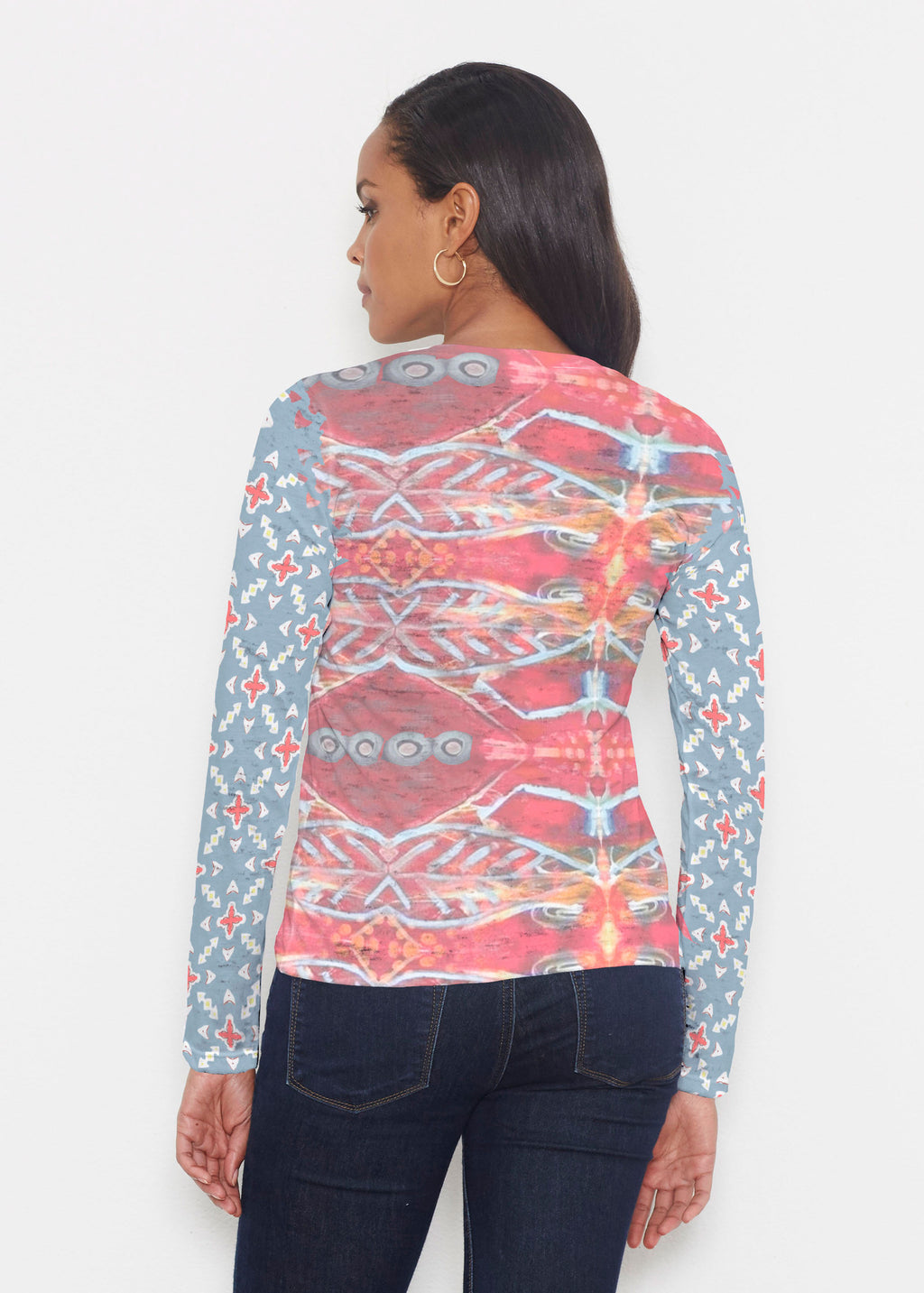 Mesmerizing desert blue, dusky orange and sunset red print with contrasting sleeve designed by JoAnn Lieberman.