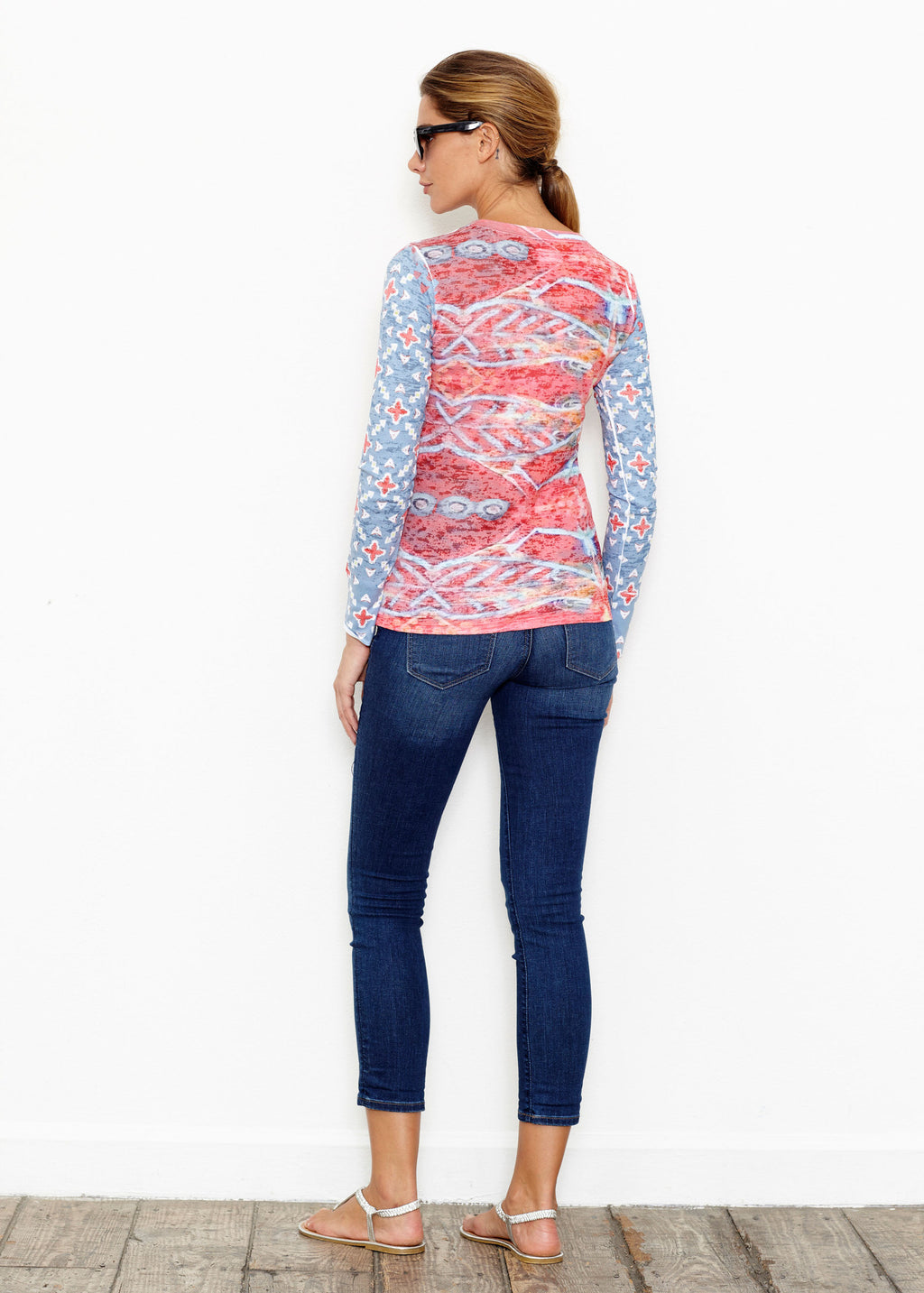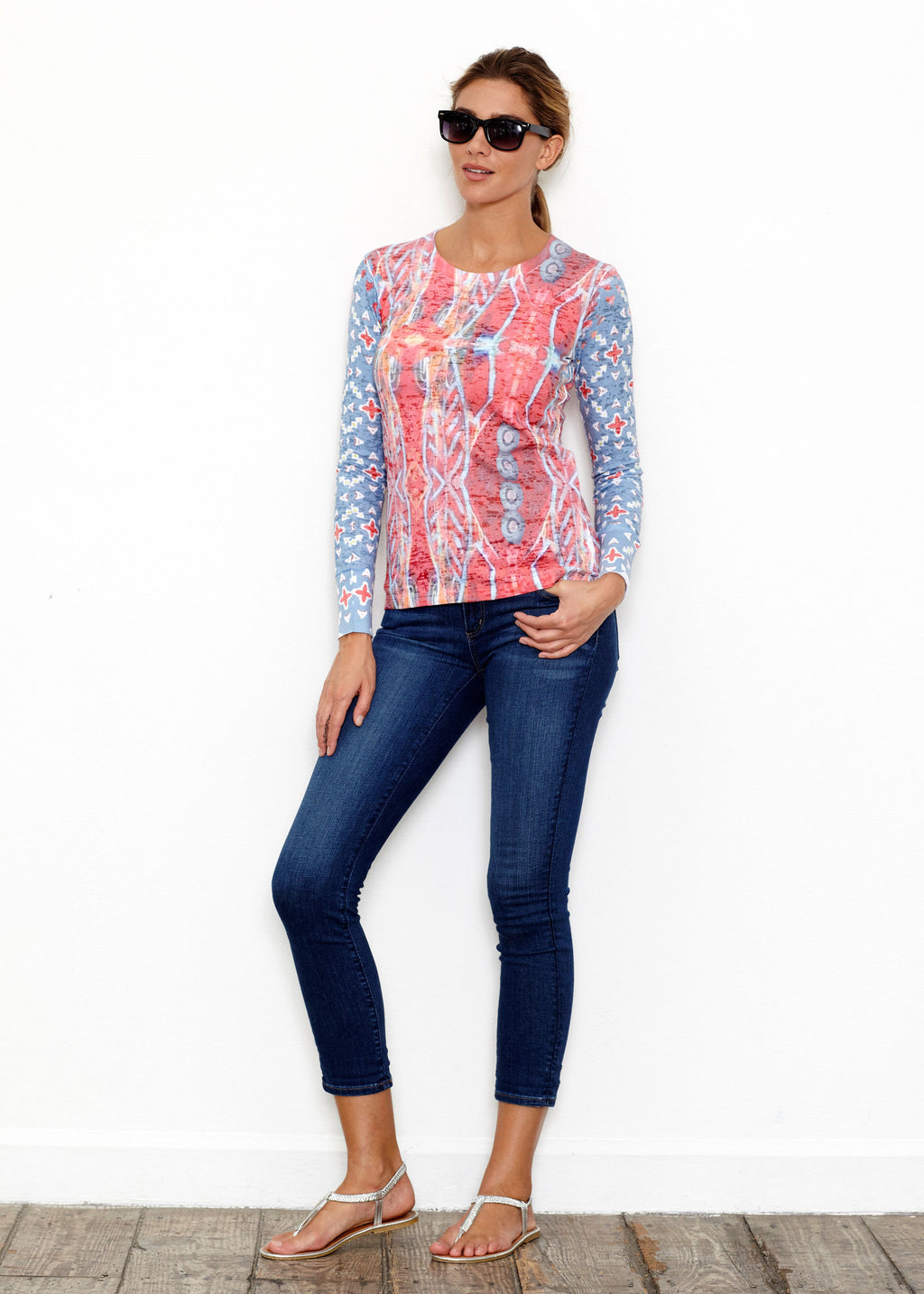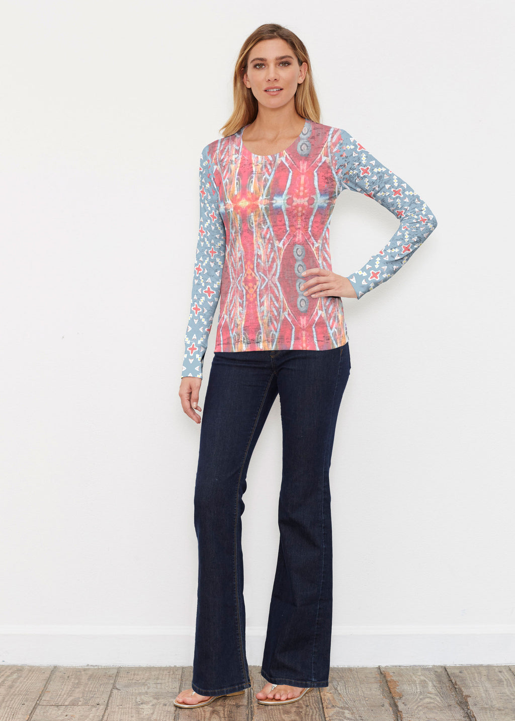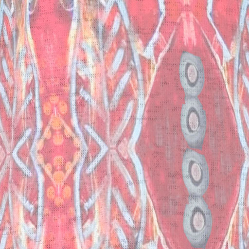 Mesmerizing desert blue, dusky orange and sunset red print with contrasting sleeve designed by JoAnn Lieberman.