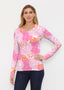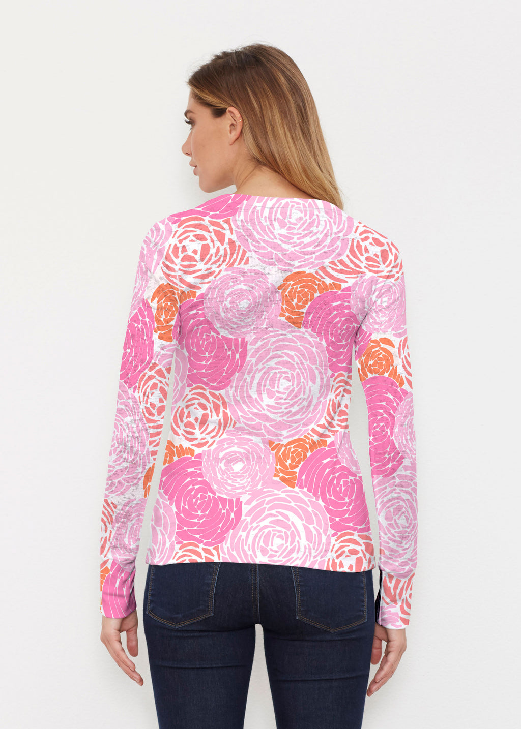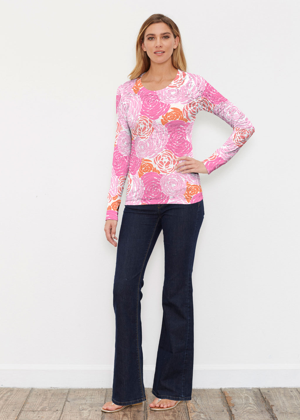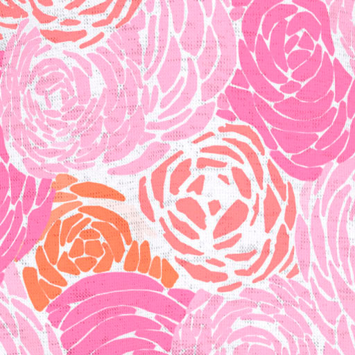A bold and bright floral with mixed shades of pink and orange designed by Chelsea Moser.