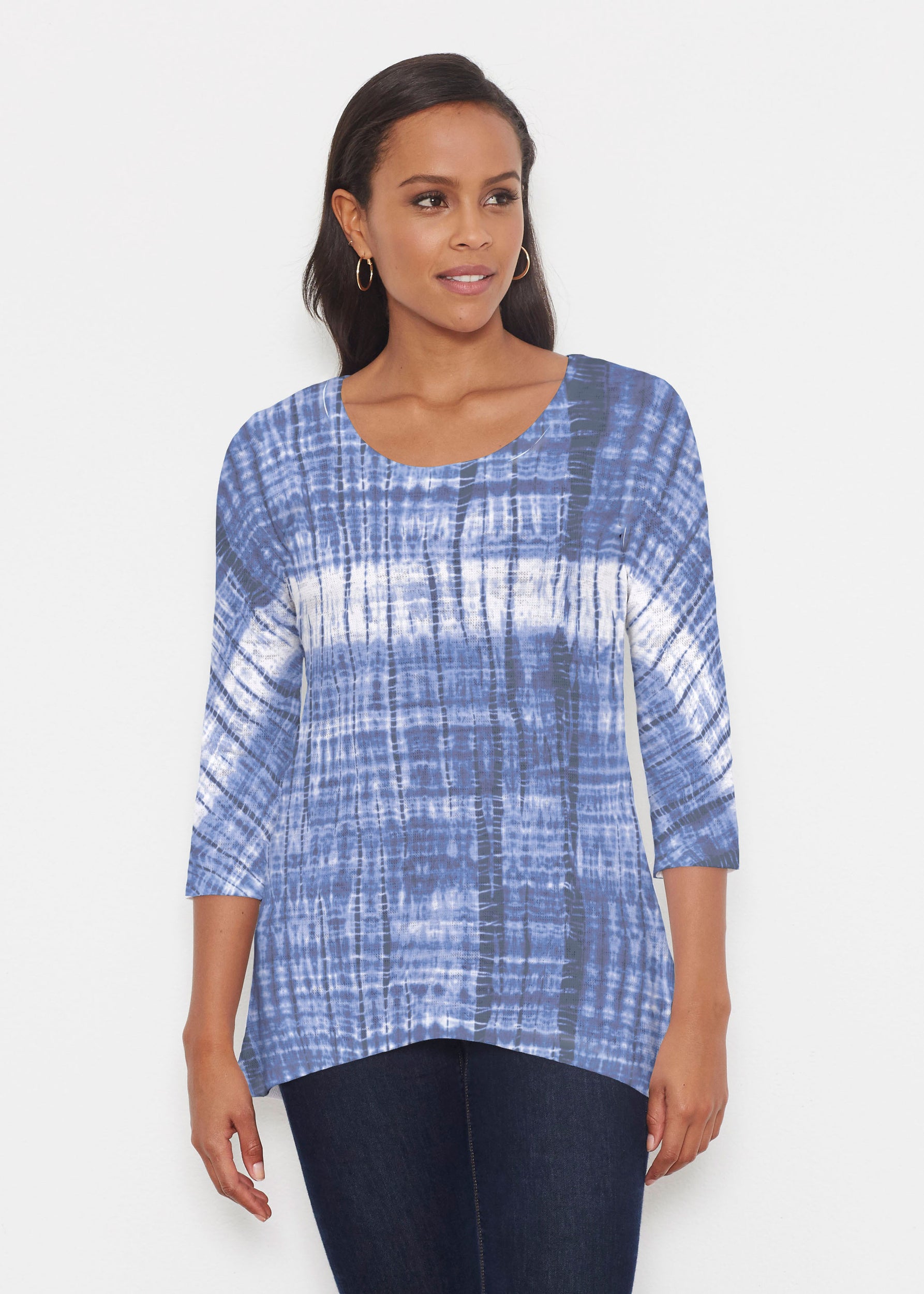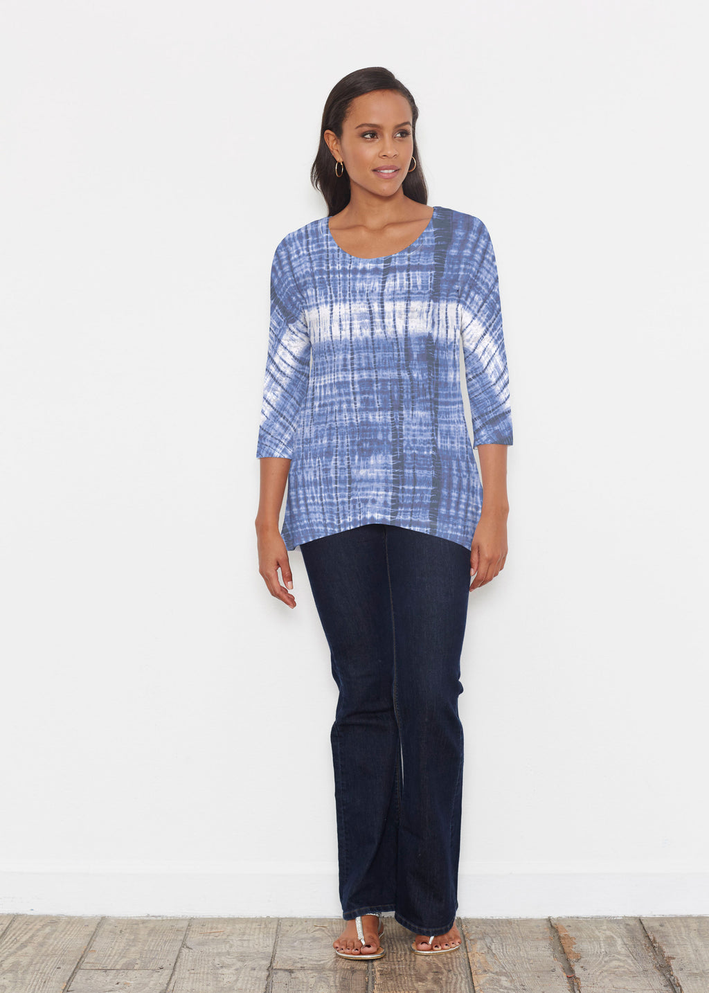 An elegant fit, the hemline falls higher in front then cascades beautifully down across back. Delicate scoop neckline and 3/4 sleeves made in our soft Baby Waffle burnout thermal blend.