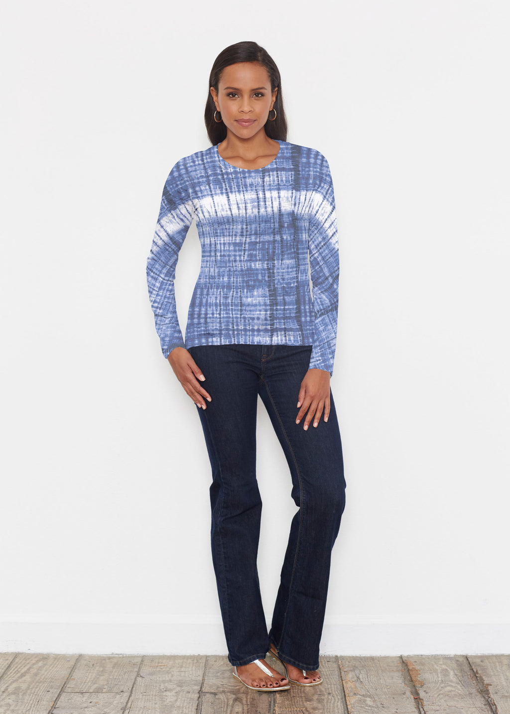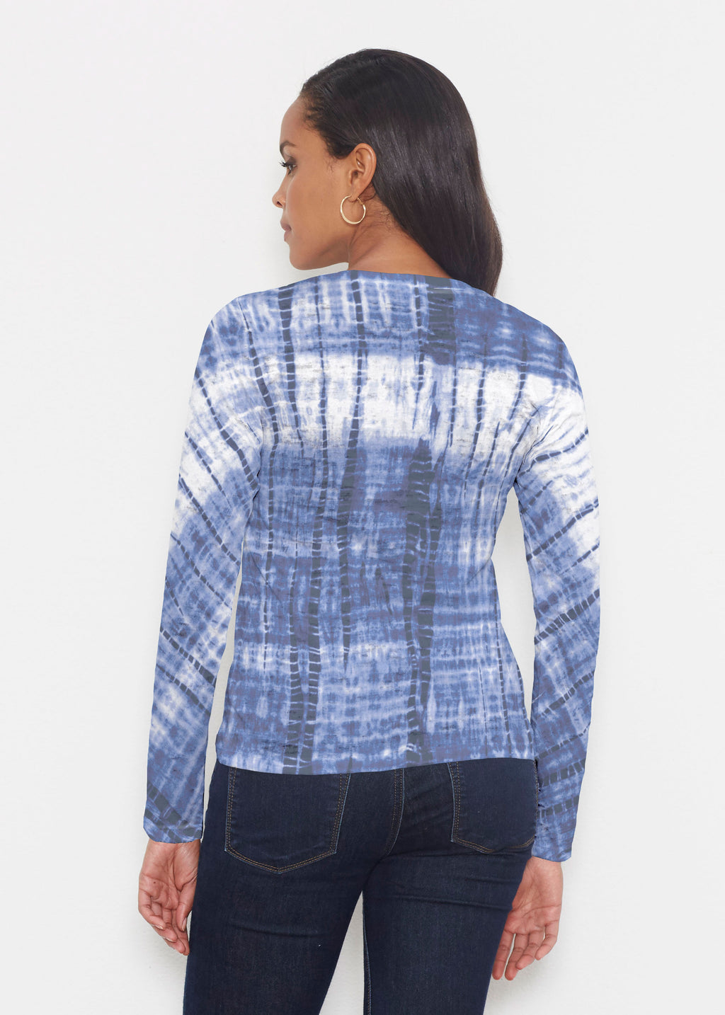 Express your boho side with this easy going abstract print using shades of denim tie dye on faux grasscloth fabric designed by Debra Valencia.
