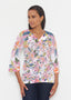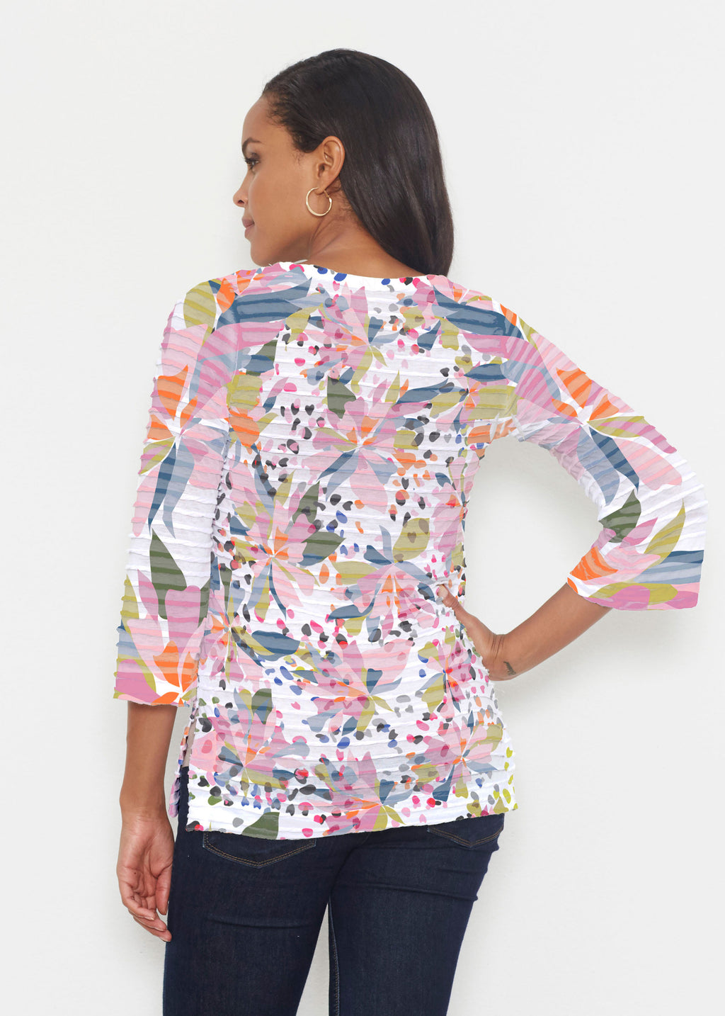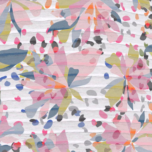 A bold burst of abstract florals and leopard spots in vibrant shades of purple, pink, blue, orange and green with more loosely patterned mixed sleeves. Designed by Susan Werner.