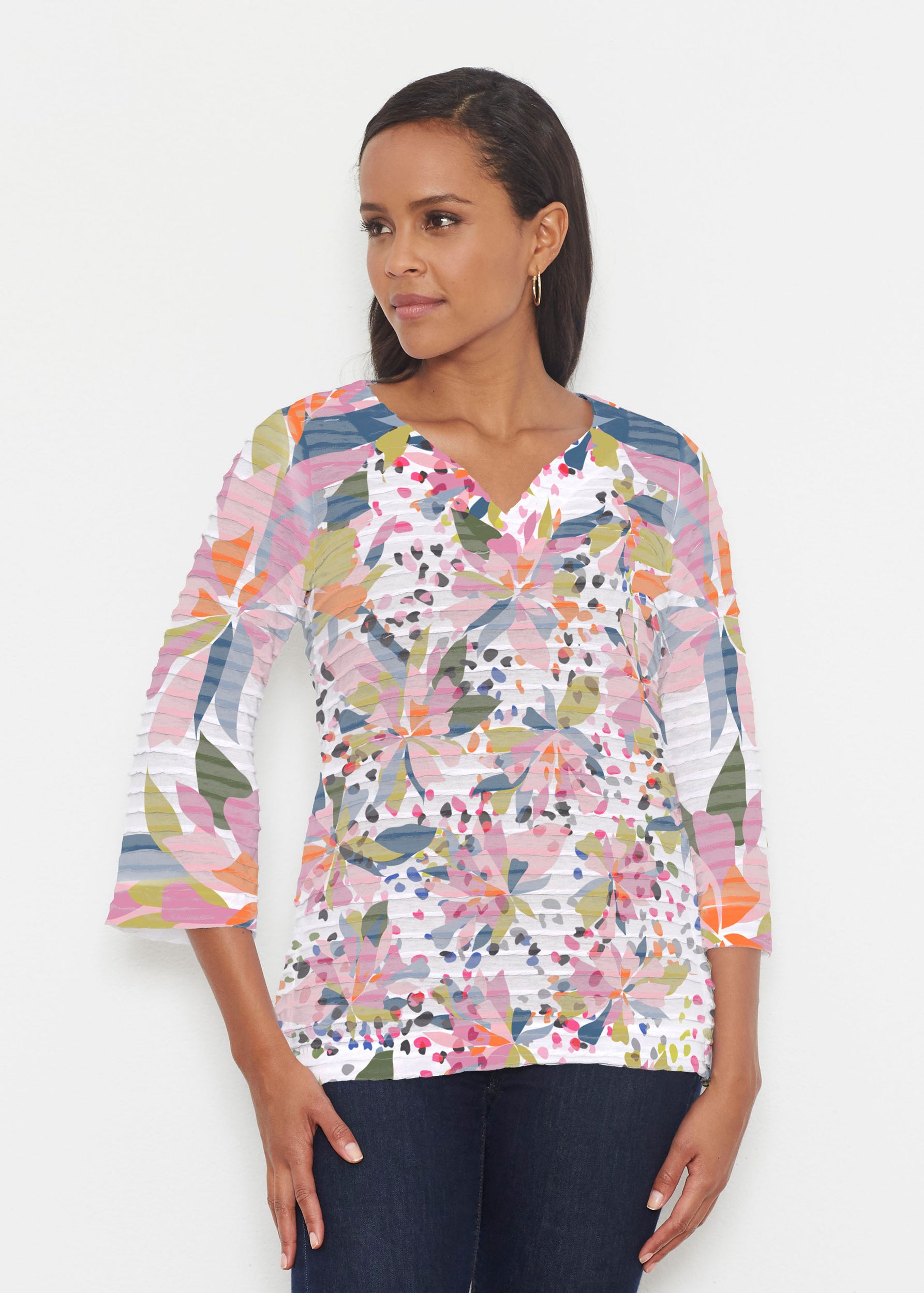Floral Leopard (7810) ~ Banded 3/4 Bell-Sleeve V-Neck Tunic