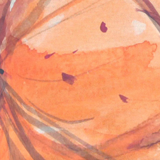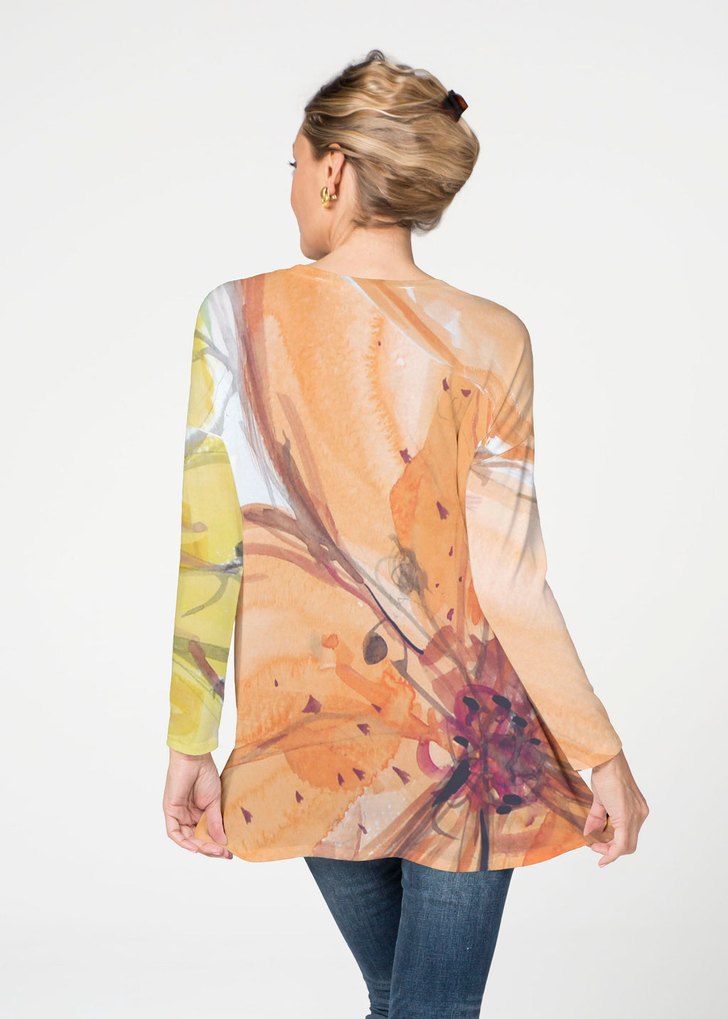 A captivating abstract floral print with asymmetrical mixed sleeves in shades of subdued orange, burgundy and yellow designed by LuAnn Roberto.