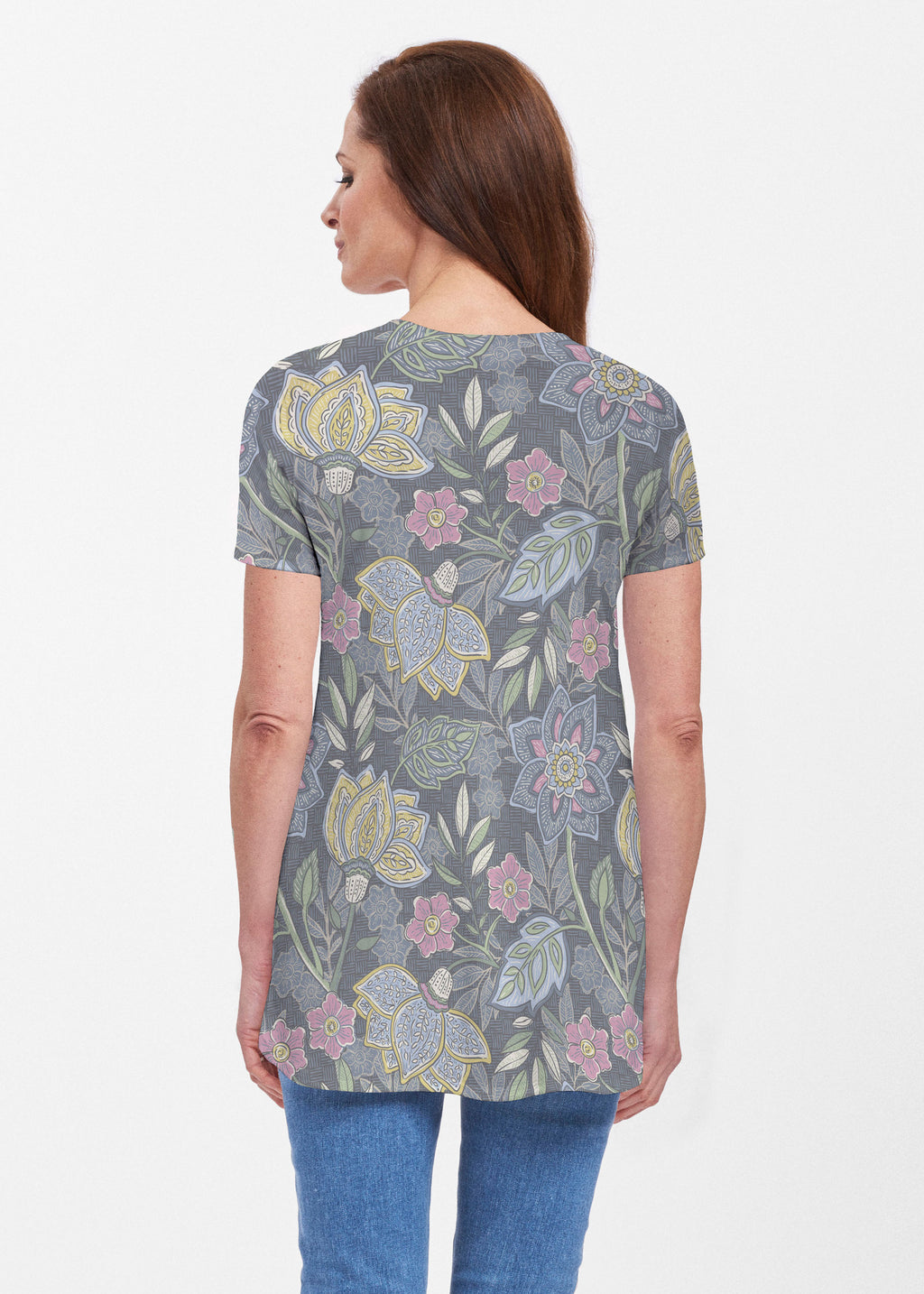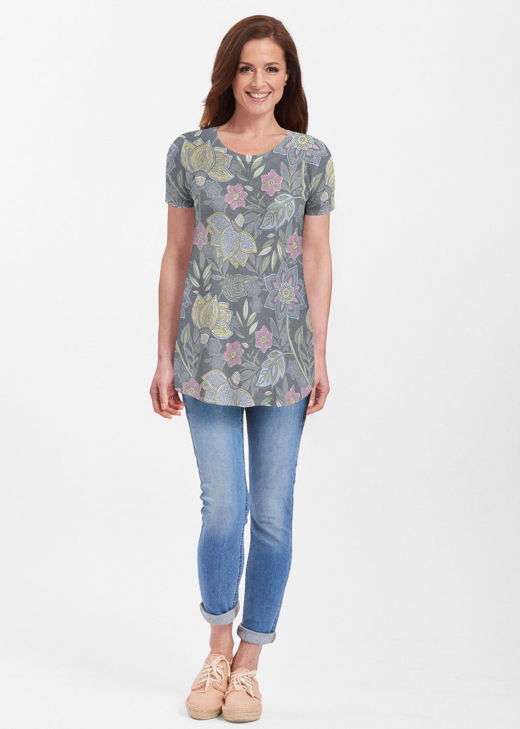 Our soft and feminine short sleeve silhouette tunic is sure to flatter any figure. Made in our Butterknit fabic that flows into a relaxed curved hem that is slightly longer in the back with subtle side slits.
