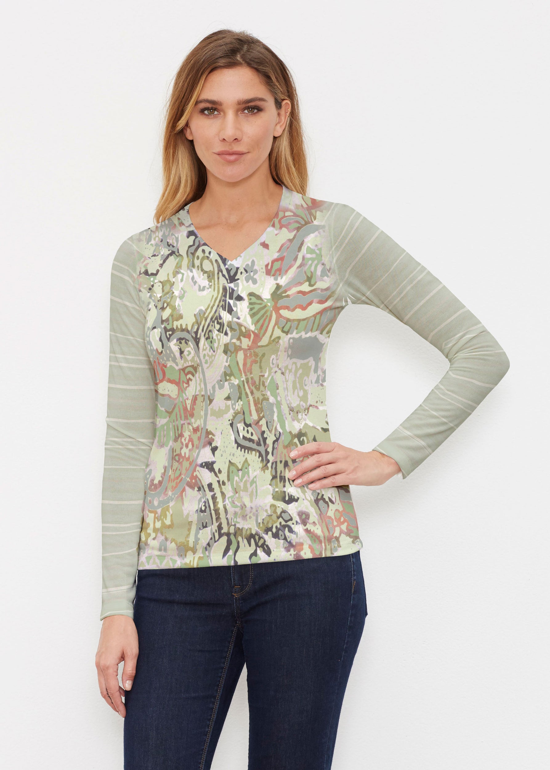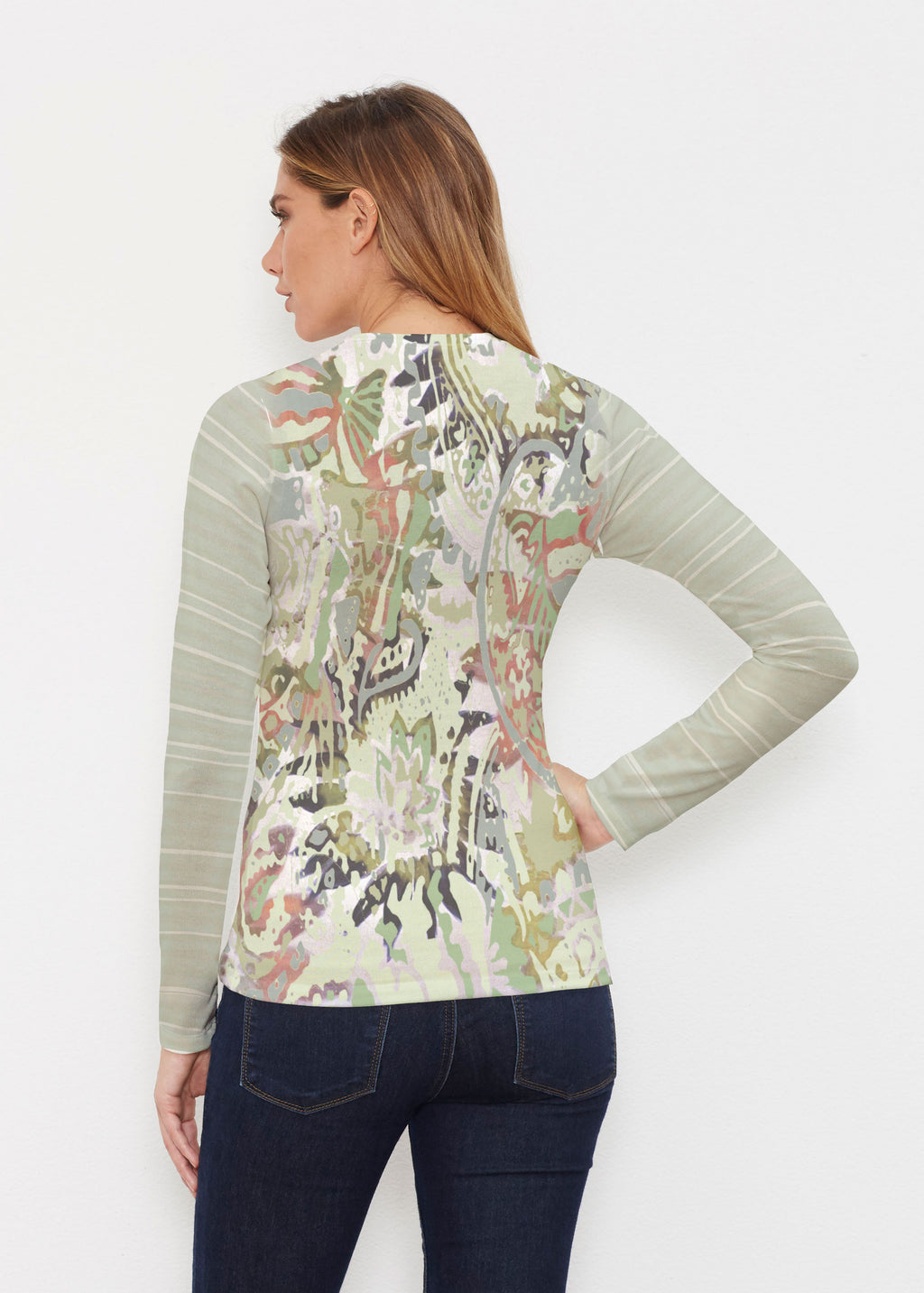 Take a walk on the wild side with this abstract print of paisley and jungle foliage with mixed striped sleeves in soft greens with red, black and grey accents. Designed by Carolyn McNeil.