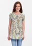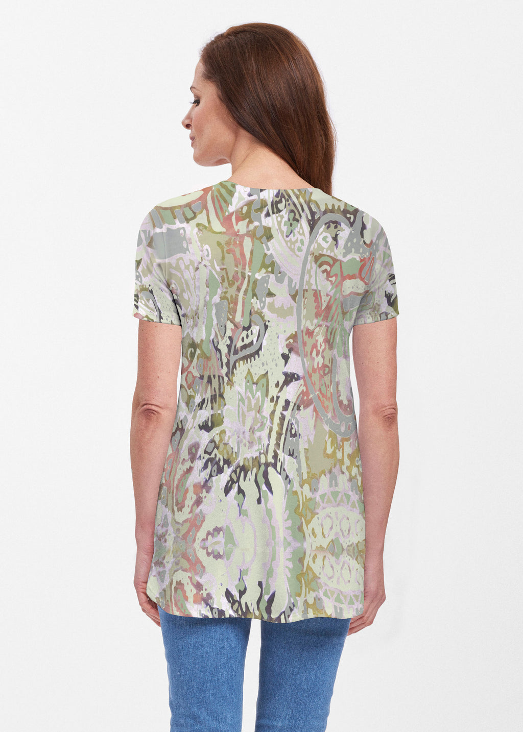 Take a walk on the wild side with this abstract print of paisley and jungle foliage with mixed striped sleeves in soft greens with red, black and grey accents. Designed by Carolyn McNeil.