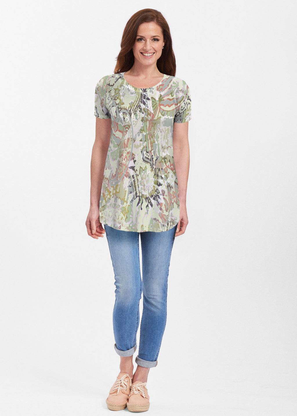 Our soft and feminine short sleeve silhouette tunic is sure to flatter any figure. Made in our Butterknit fabic that flows into a relaxed curved hem that is slightly longer in the back with subtle side slits.