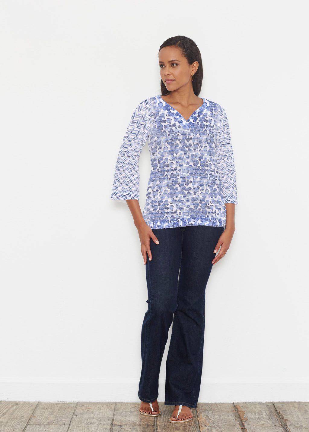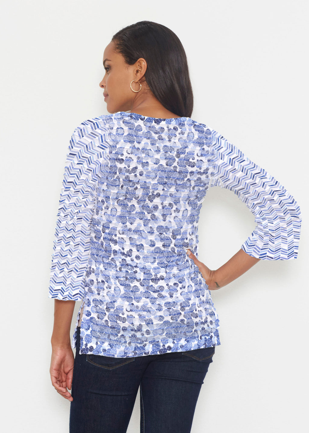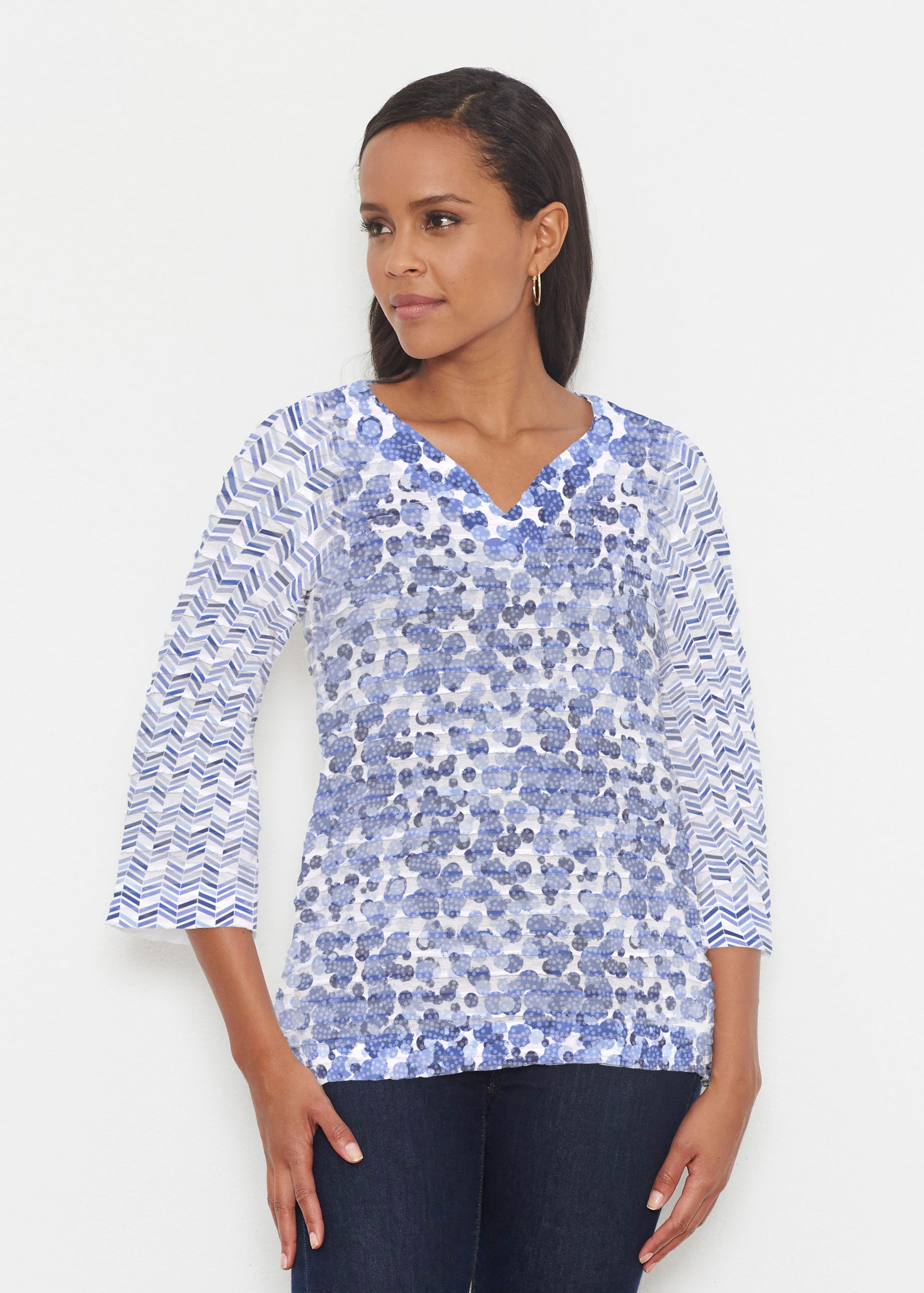 A fun print of mottled dots with chevron inspired mixed sleeves in a beautiful spectrum of blues designed by Susan Werner.