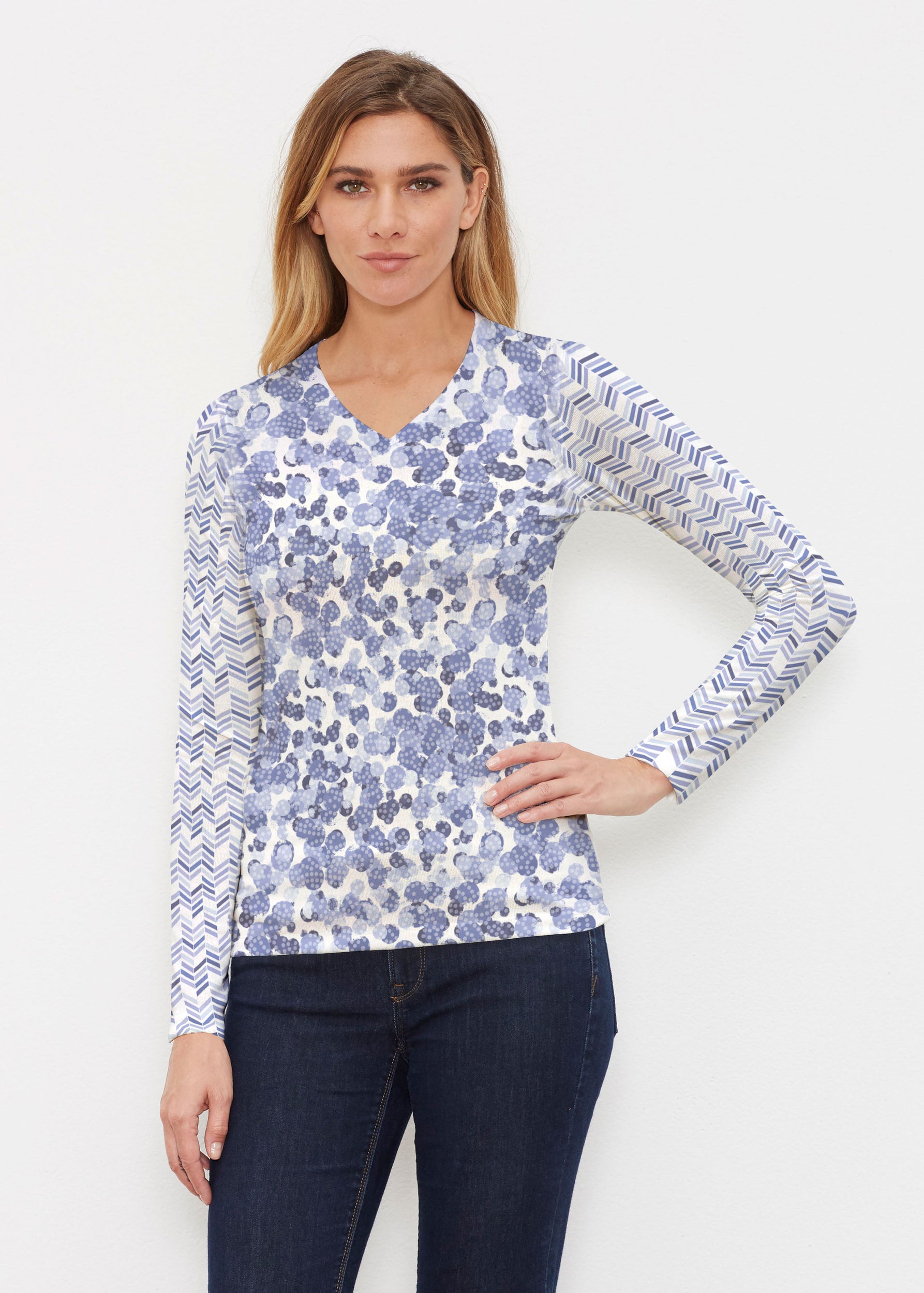 A fun print of mottled dots with chevron inspired mixed sleeves in a beautiful spectrum of blues designed by Susan Werner.
