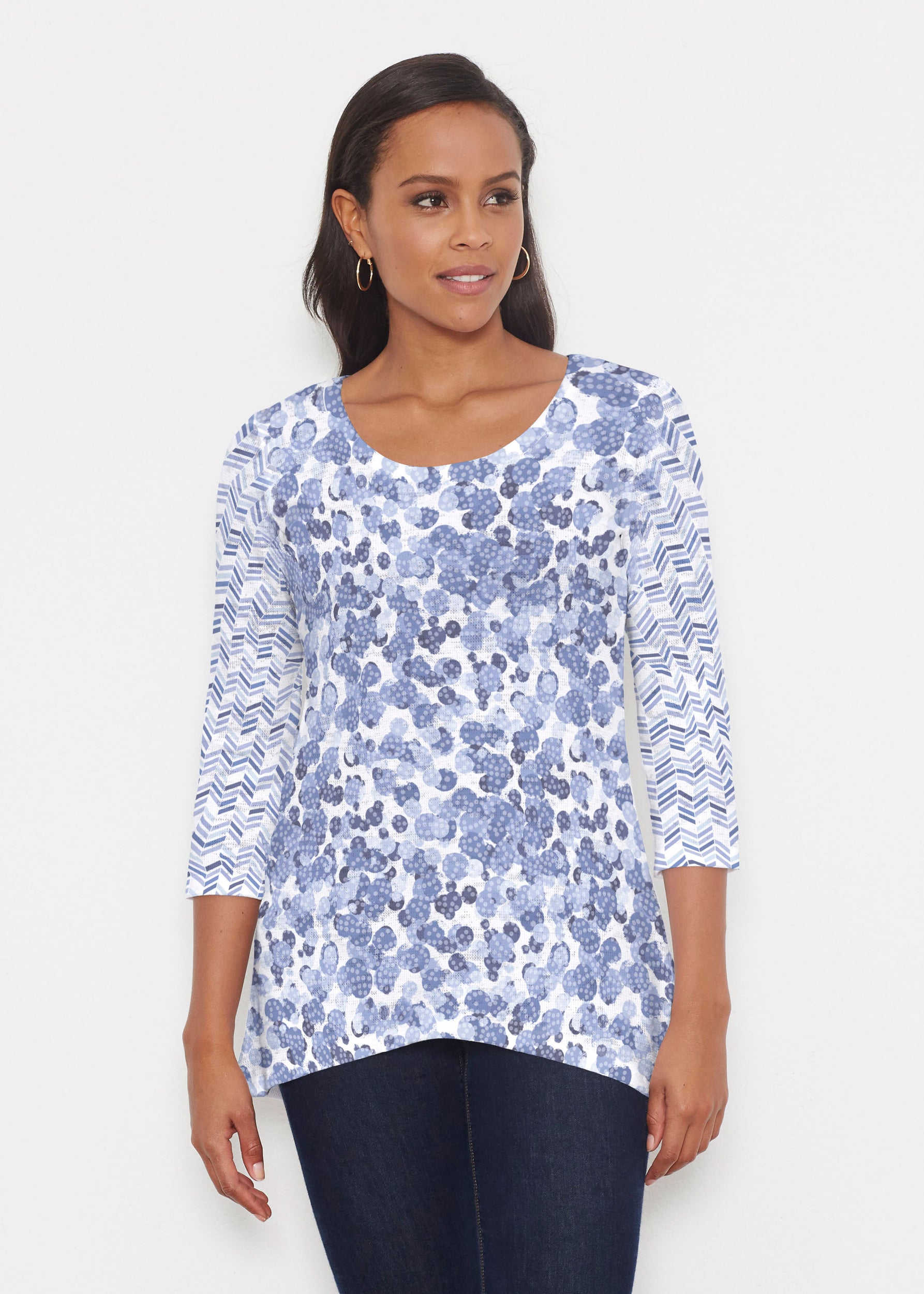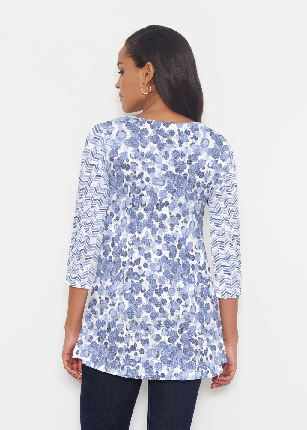 A fun print of mottled dots with chevron inspired mixed sleeves in a beautiful spectrum of blues designed by Susan Werner.