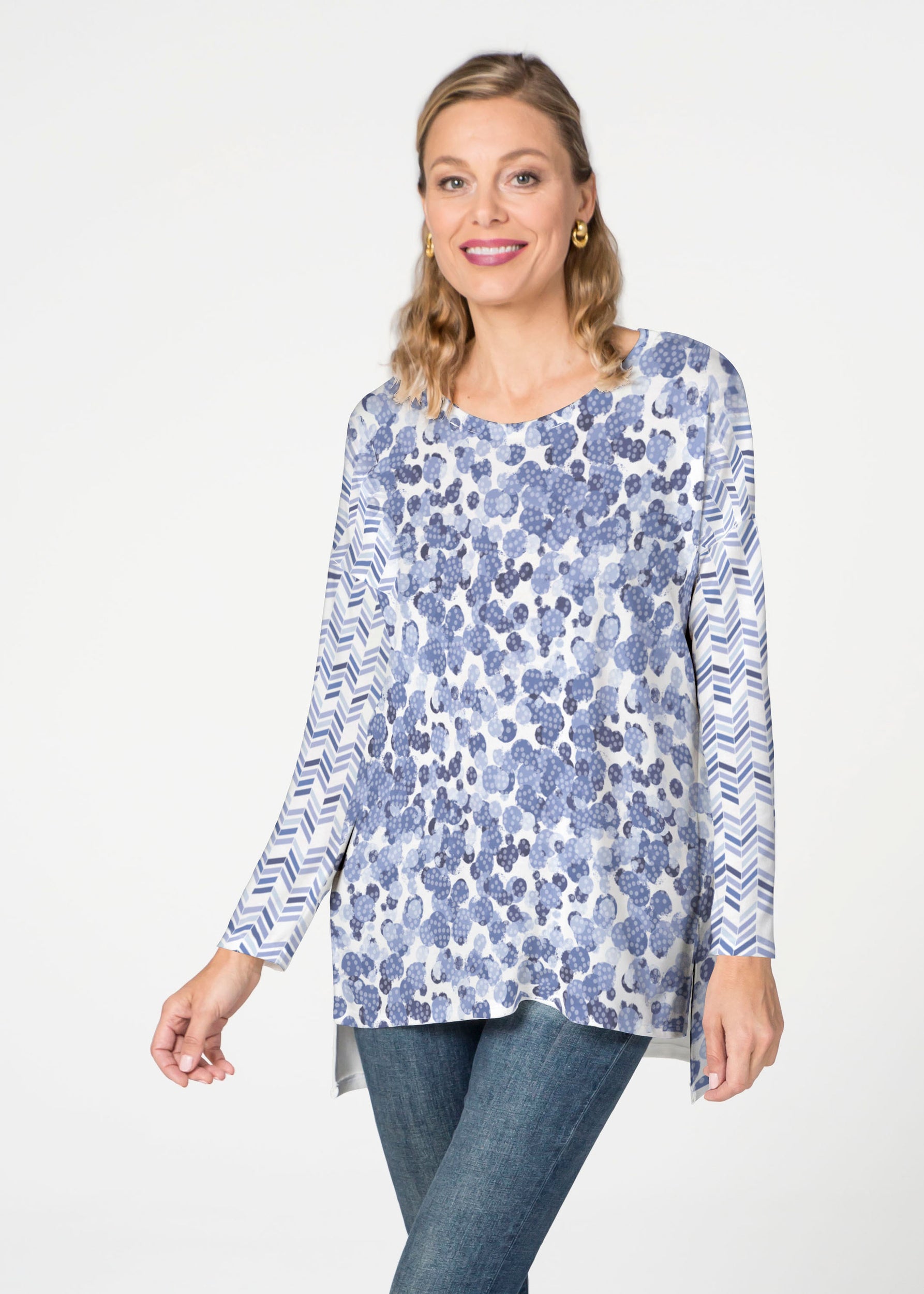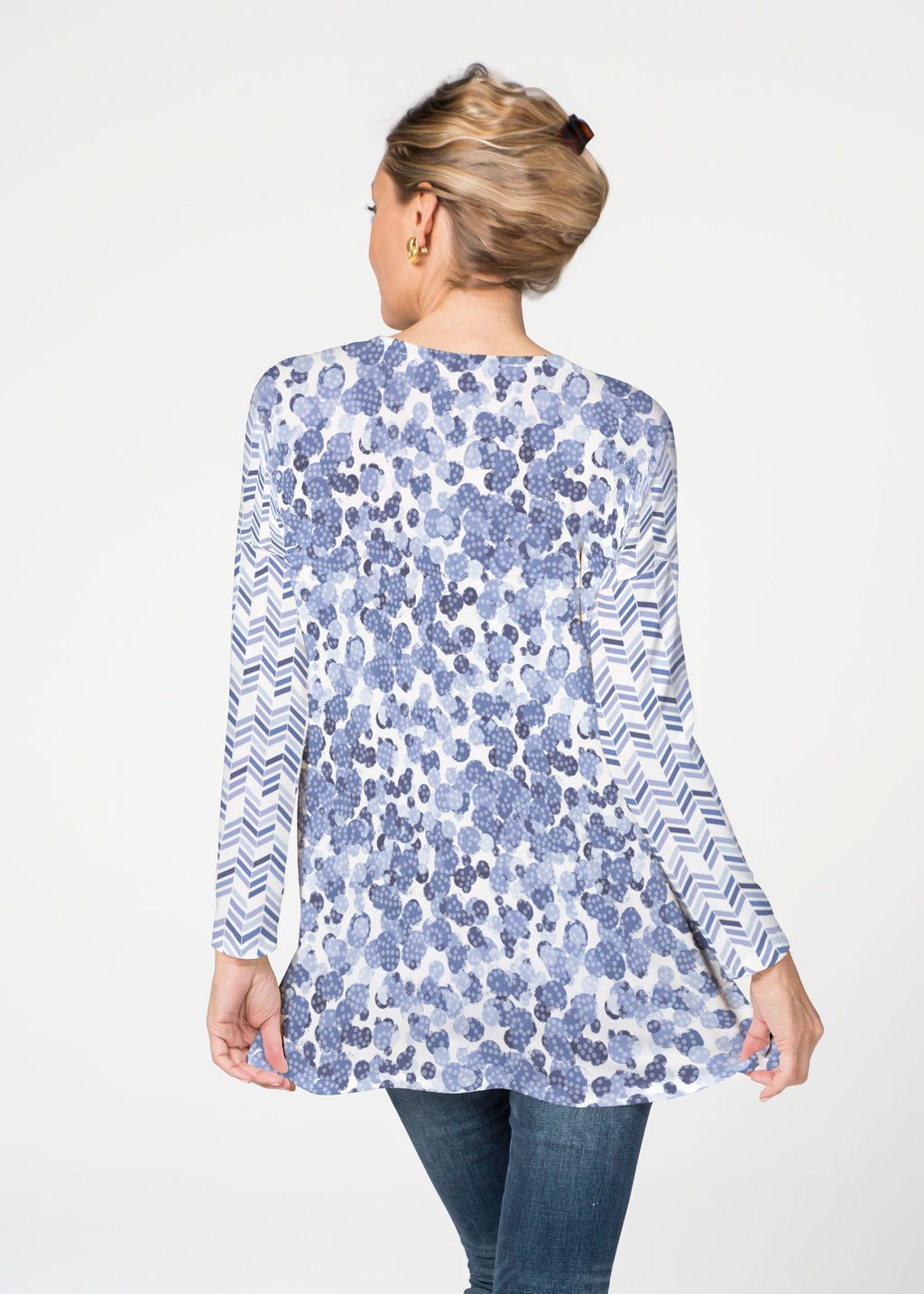A fun print of mottled dots with chevron inspired mixed sleeves in a beautiful spectrum of blues designed by Susan Werner.
