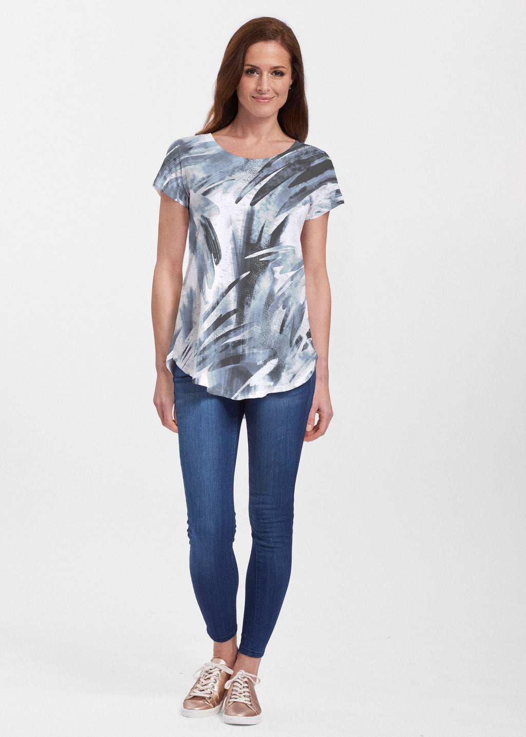 An effortlessly flattering tunic in our soft Signature burnout fabric featuring short sleeves and a scoop neck with a body that flows into a full, swinging shirttail hem.