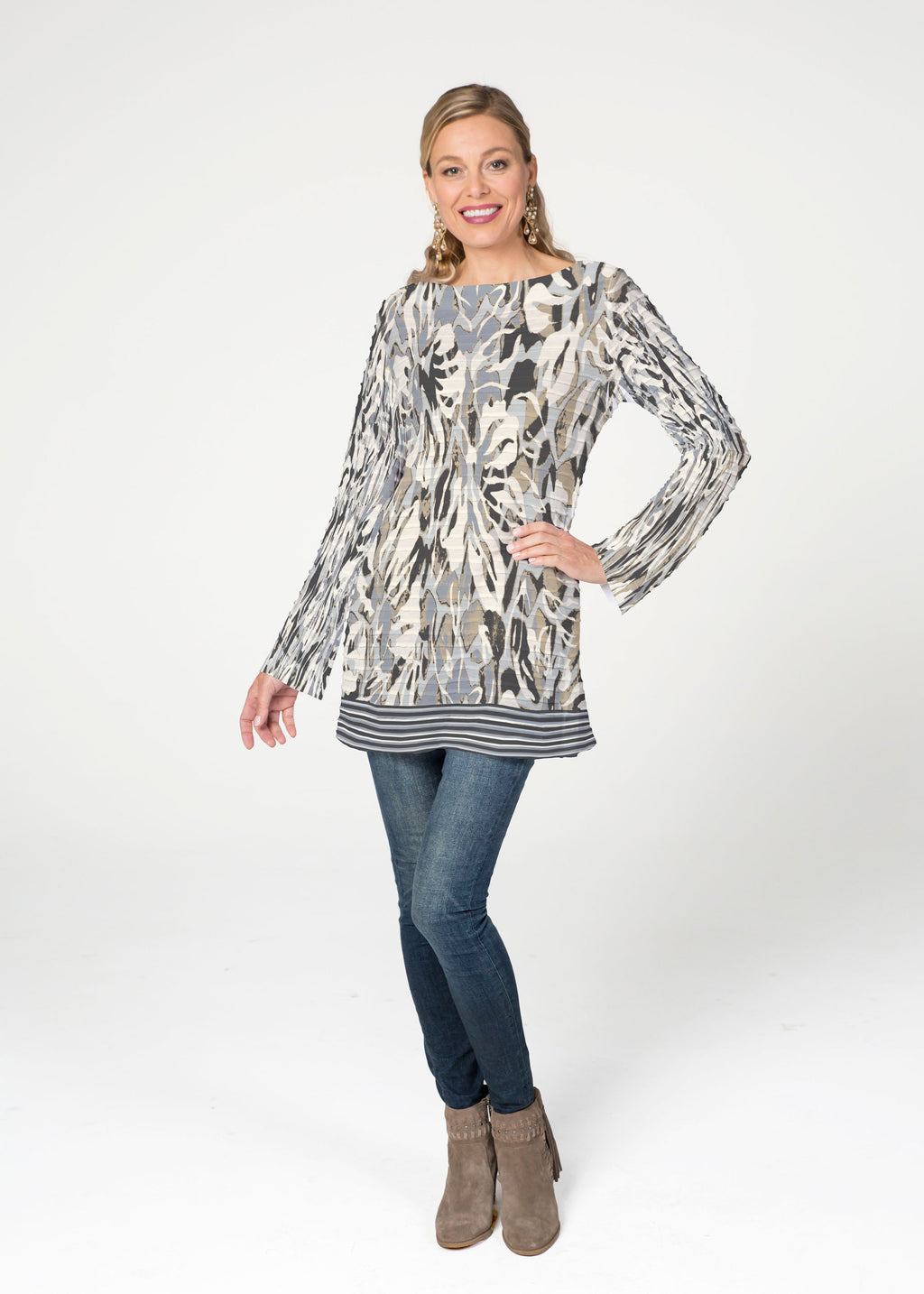 The Banded Boatneck Tunic has the soft pleated texture of our Banded fabric, making this a sophisticated, casual year round piece. A forgiving fit, side vents, with a relaxed full length sleeve combine for a flattering look. The hemline flows gently over the hip.