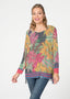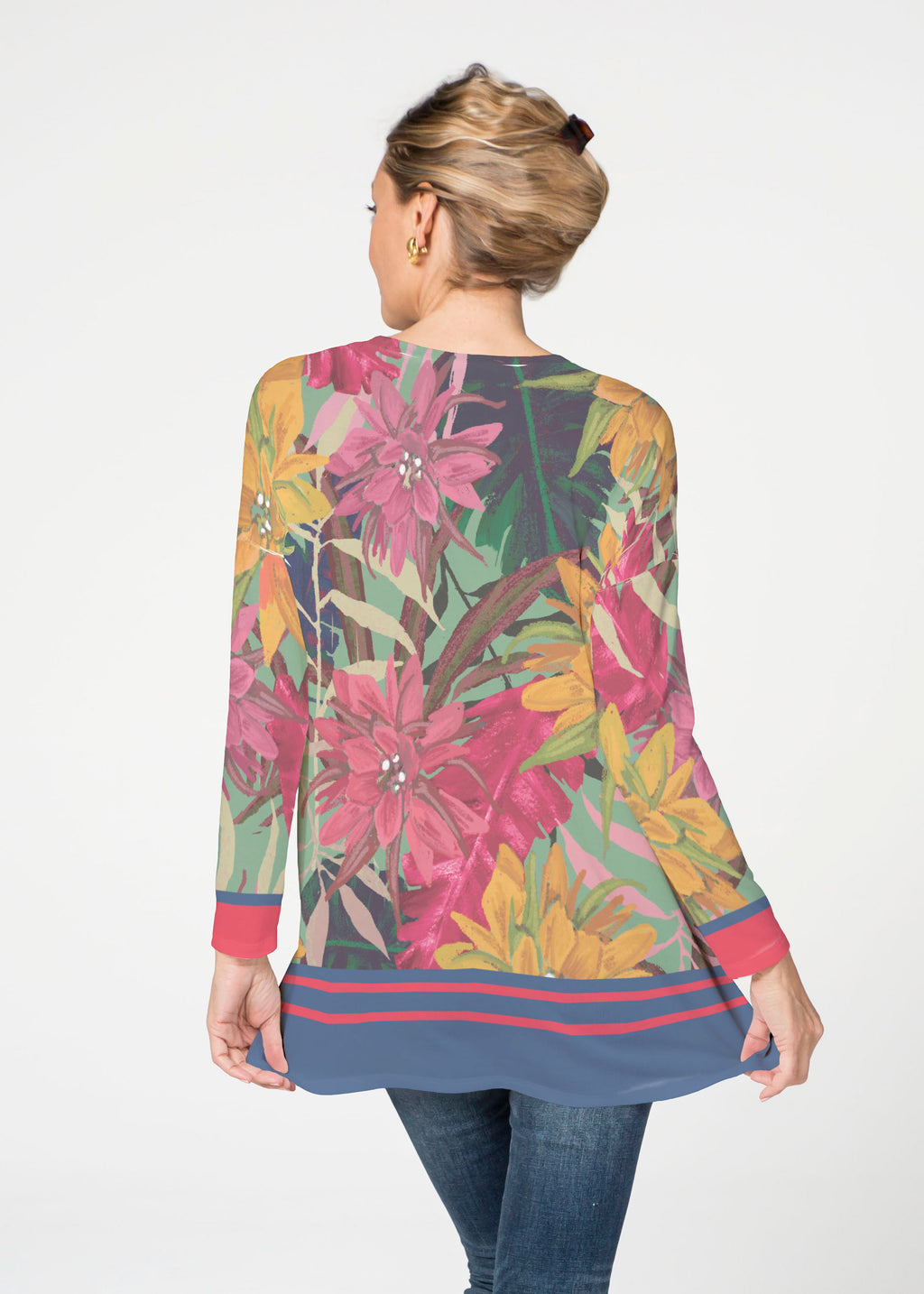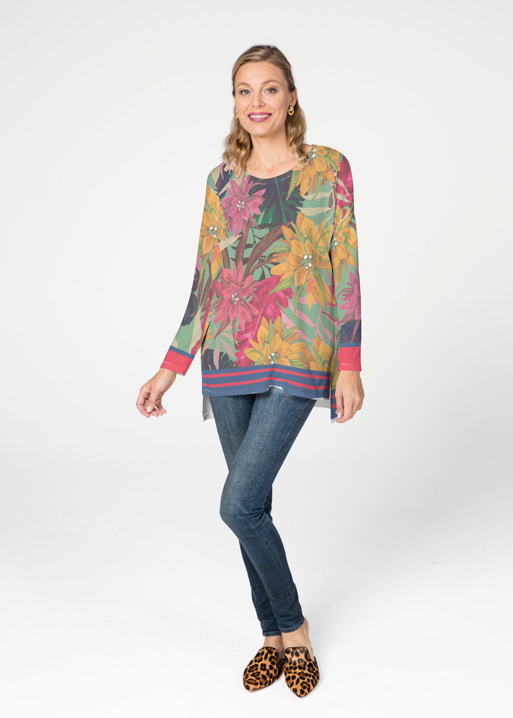 A beautiful mixed floral print in navy, red, yellow and green with a fun trendy striped added at the bottom and sleeves designed by Jeanetta Gonzales..