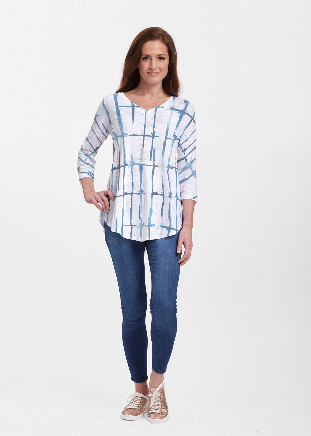 This v-neck tunic in our Signature burnout fabric is forever flattering. 3/4 sleeves and a v-neck flow into a full, swinging shirttail hem.