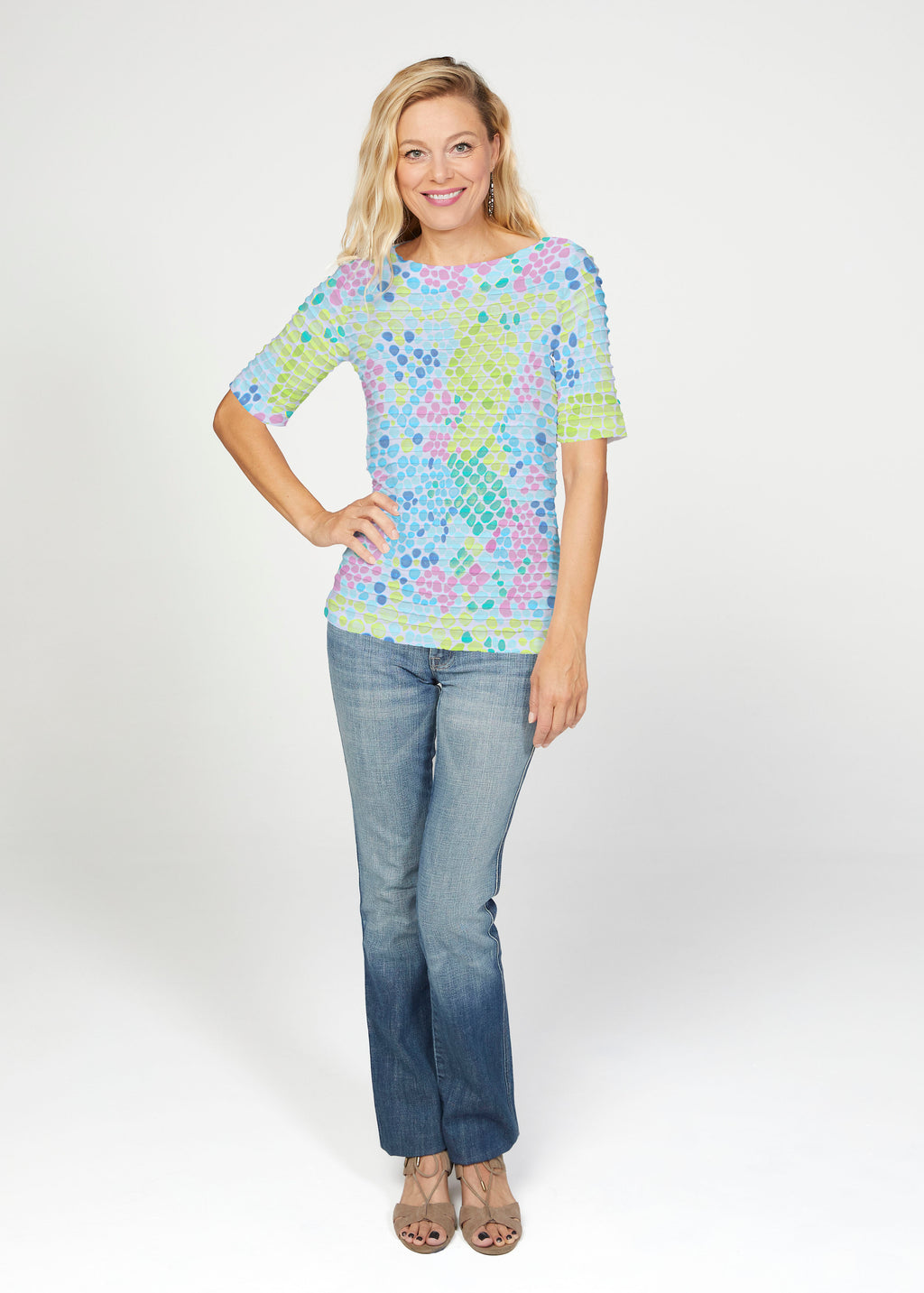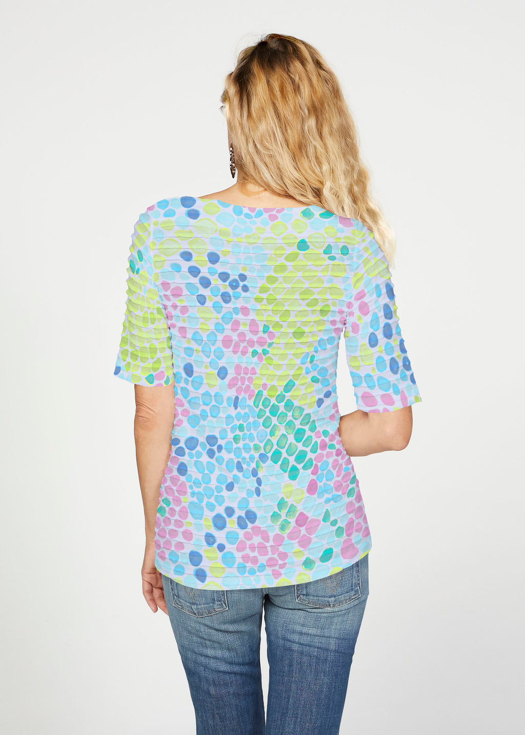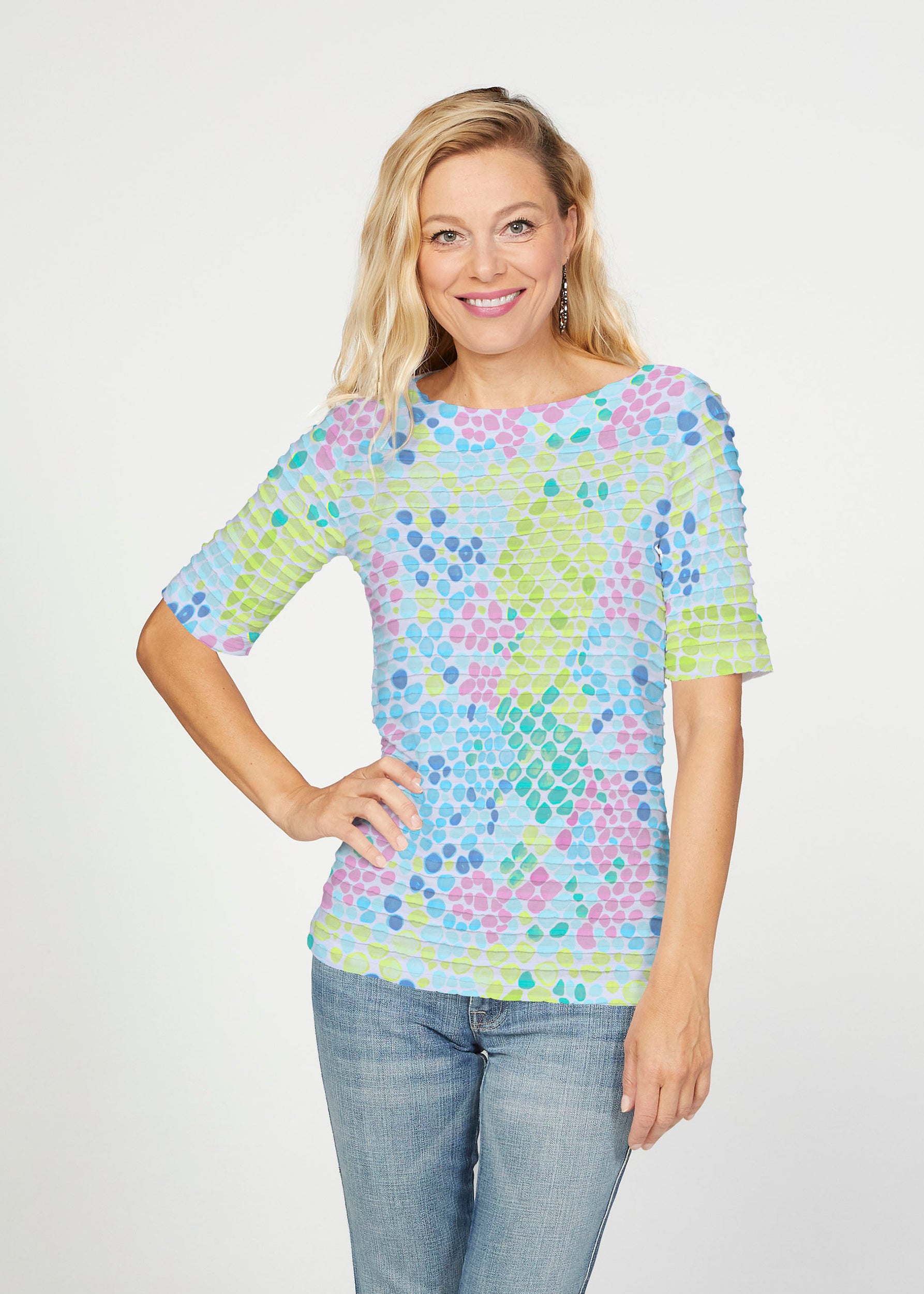 The uniquely soft, pleated texture in this Banded fabric gives the elbow sleeve and boat neck top a fun and sophisticated look. Easy relaxed fit with a hemline that comes below the hip.