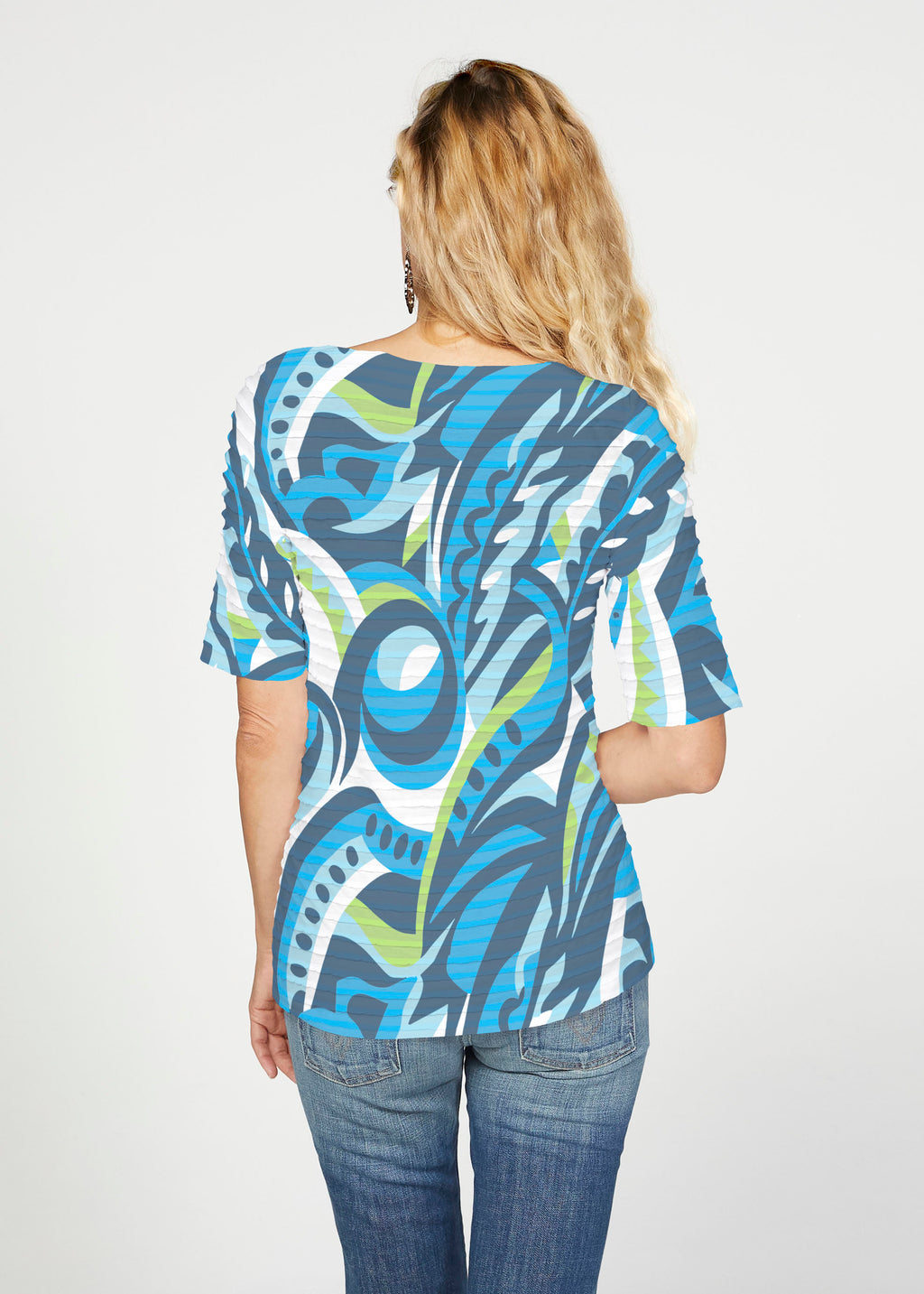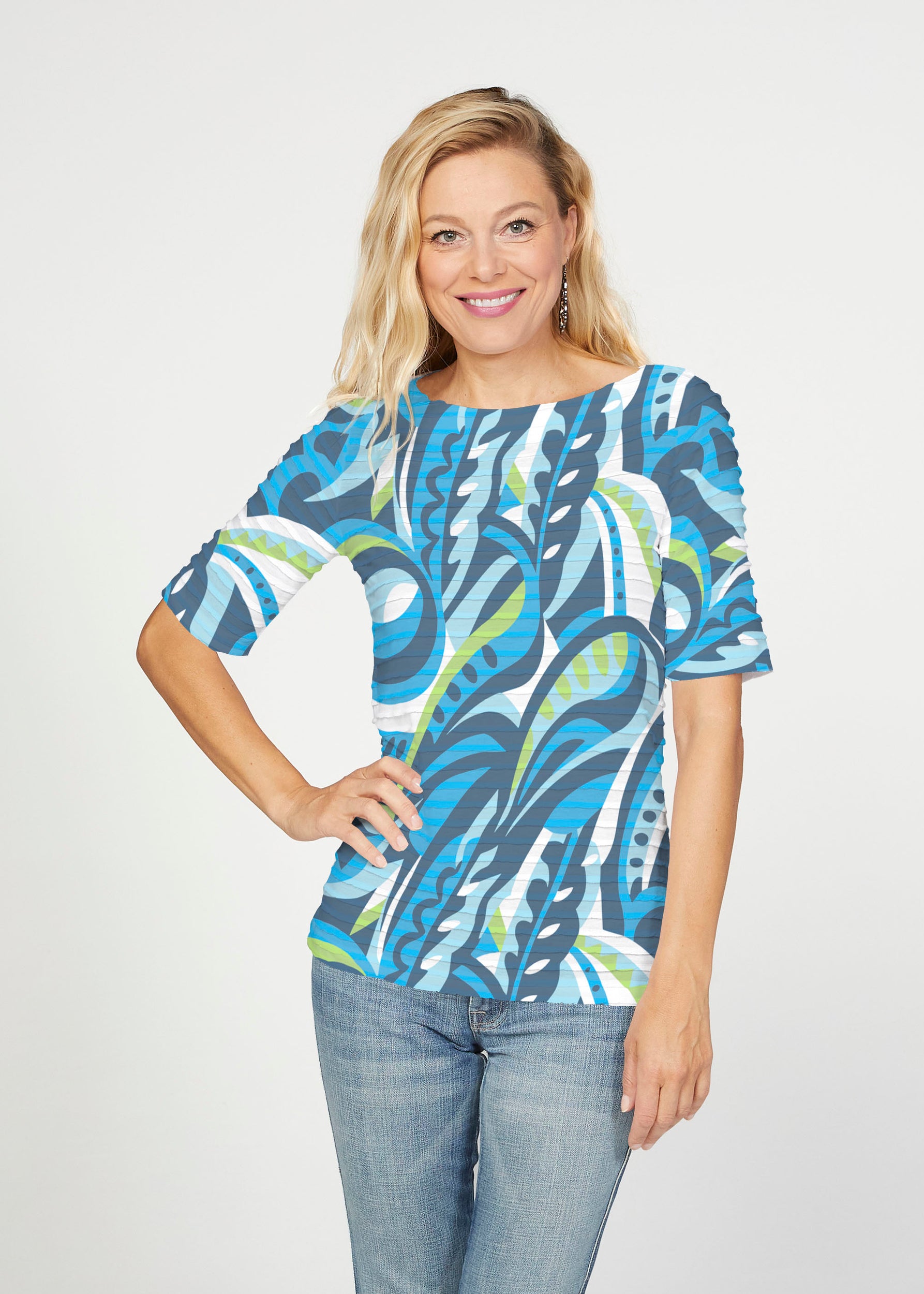 The uniquely soft, pleated texture in this Banded fabric gives the elbow sleeve and boat neck top a fun and sophisticated look. Easy relaxed fit with a hemline that comes below the hip.