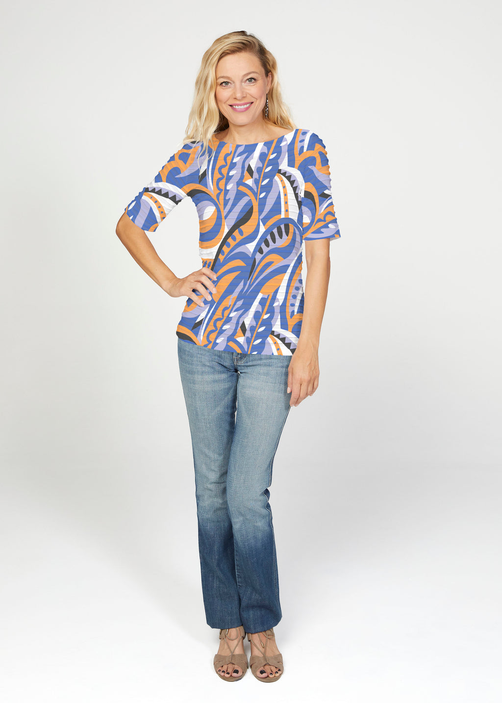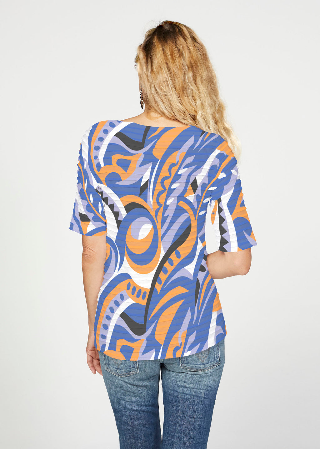 The uniquely soft, pleated texture in this Banded fabric gives the elbow sleeve and boat neck top a fun and sophisticated look. Easy relaxed fit with a hemline that comes below the hip.