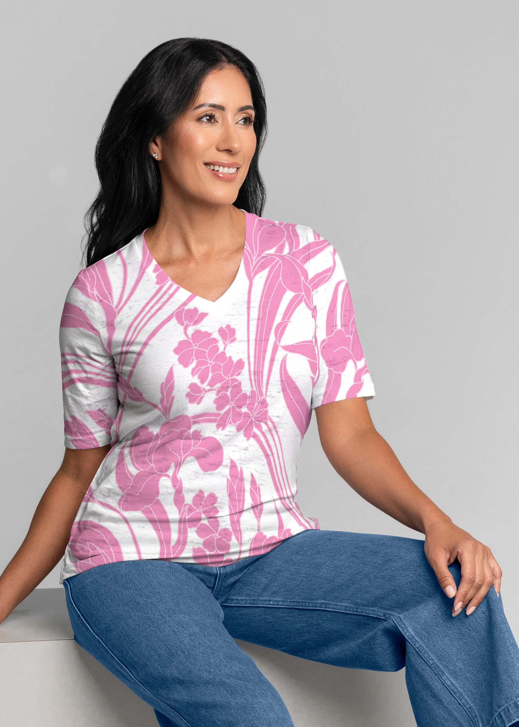 • Iris and Vine Pink (26050) ~ Signature Elbow Sleeve V-Neck Top