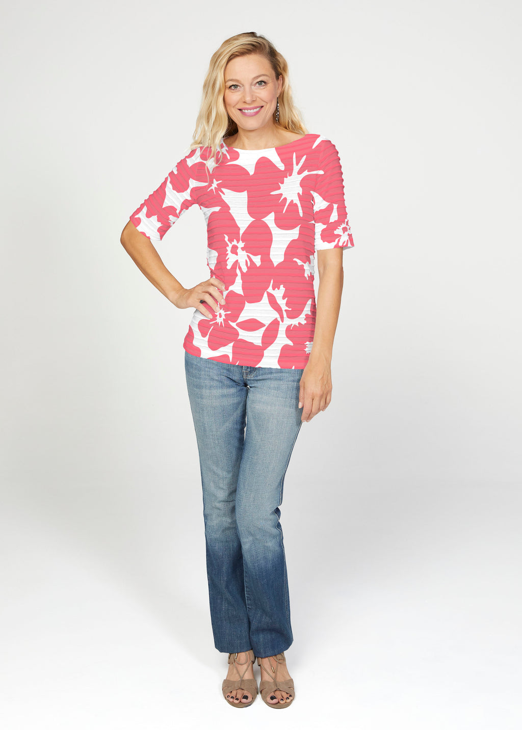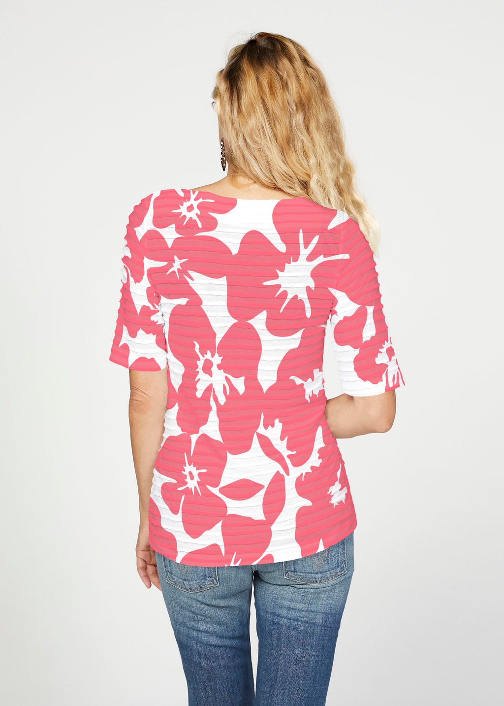 The uniquely soft, pleated texture in this Banded fabric gives the elbow sleeve and boat neck top a fun and sophisticated look. Easy relaxed fit with a hemline that comes below the hip.