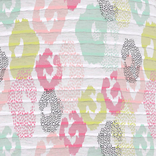 A striking and playful print of mottled, abstract geometrics in hues of pink, aqua, lime and black designed by Susan Werner.
